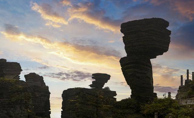 想要登上金顶,必须手脚并用,借助铁链才能爬上去,一登顶,你会体验到“一览众山小”的感觉。这里的蘑菇石也不要错过,悬崖边上蘑菇形状的石柱冲破云层在这里高高矗立,这样的自然奇观,无不感叹大自然的鬼斧神工。