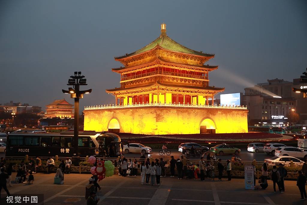 2023年3月7日晚,西安,明代古建筑钟楼和鼓楼流光溢彩,吸引游客打卡。