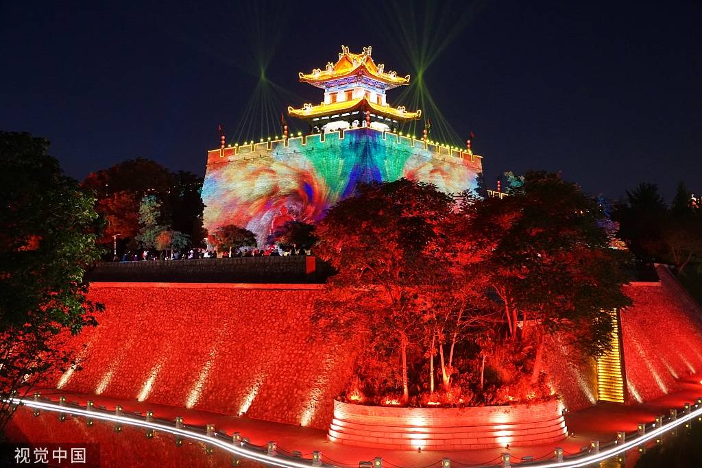 2021年5月1日,西安明城墙上演“五一”劳动节主题裸眼3D灯光秀。