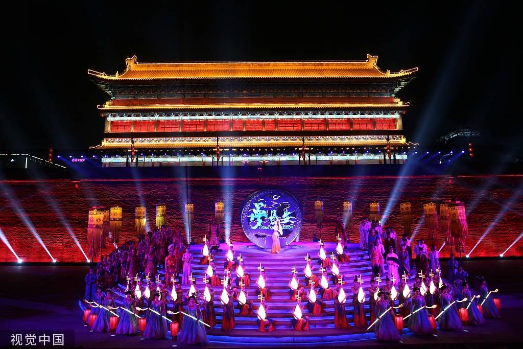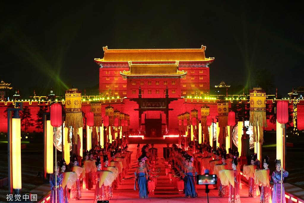2023年4月1日,西安,以盛唐礼仪文化为主题的迎宾演出《梦长安—大唐迎宾盛礼》在阔别许久后,于永宁门正式复演。
