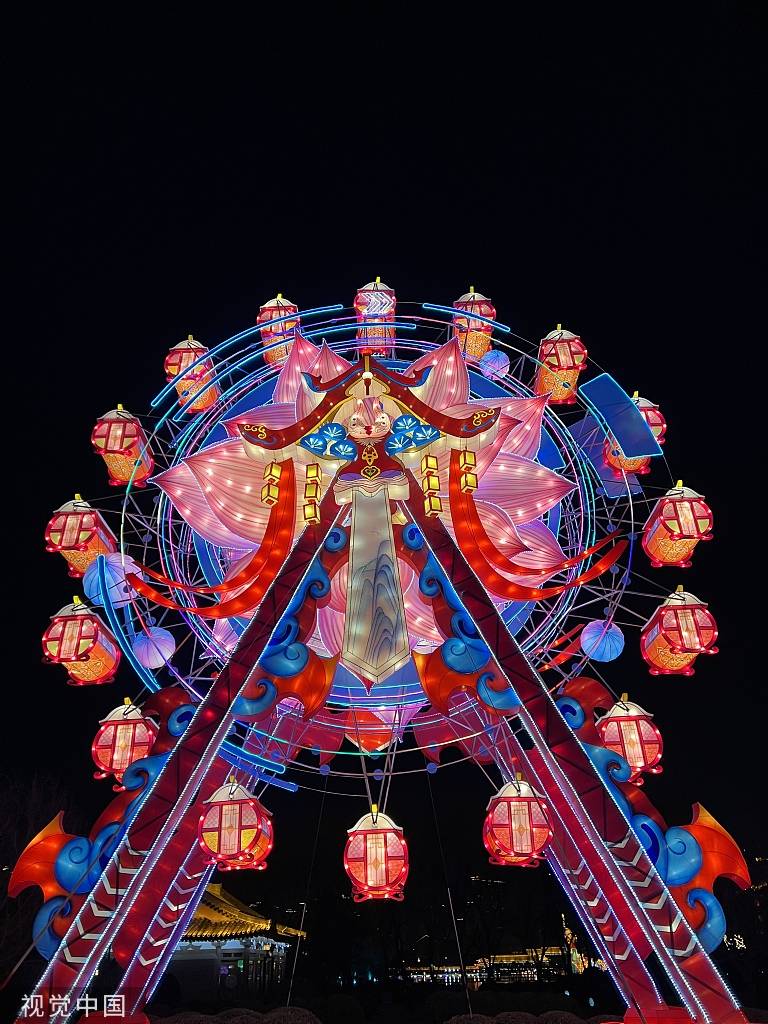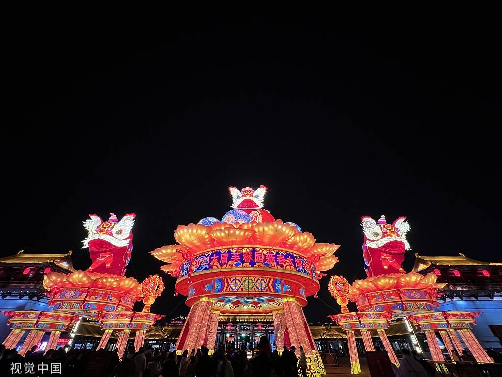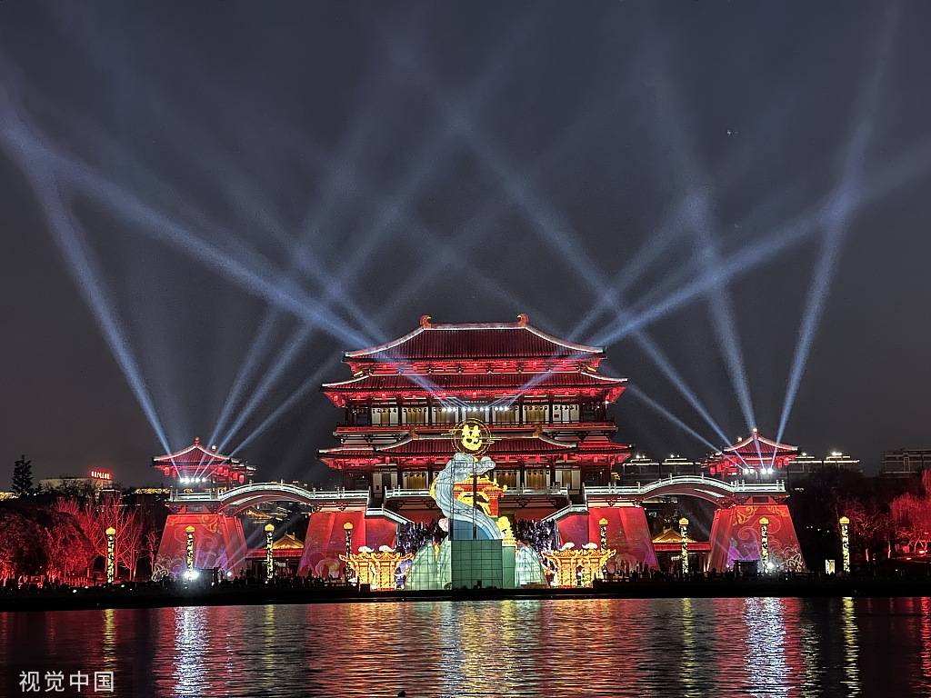 2023年1月29日,西安,大唐芙蓉园在春节期间举办灯会,景区建筑流光溢彩。