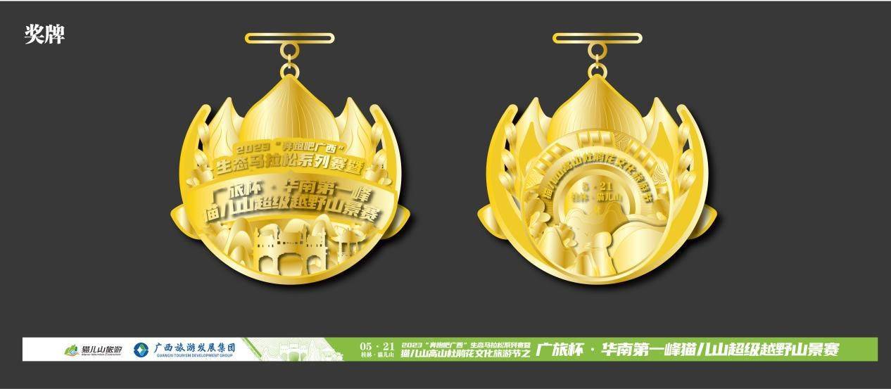赛事主办方为让赛事更具纪念意义,在奖牌、服装设计,融入杜鹃花、猫儿山、瑶族等元素,奖牌整体以绽放的杜鹃花造型,正面由杜鹃花丛衬托突出主题,顶部是绽放的杜鹃花朵,边缘的圆柱屹立,背面使用正面的负型造型,形似猫头,突出猫儿山的特色,少数民族花纹环绕圆环,底部猫猫儿山景,建筑、山脉、杜鹃花环绕,将奖牌打造得更具地域特色。