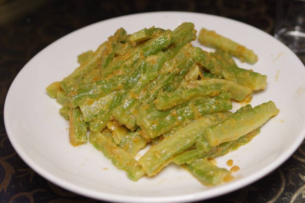 咸蛋黄炒苦瓜:蛋黄化得充分,苦瓜条包裹均匀,可见人家厨师的基本功还是可以的。