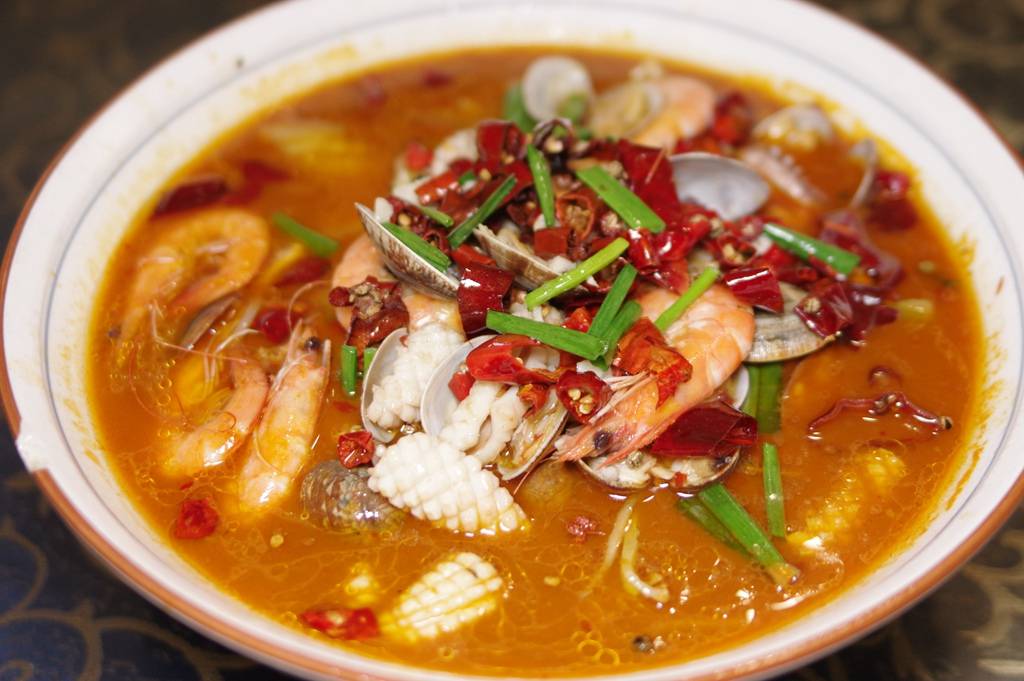 水煮三鲜:从水煮鱼演变而来的这道菜几乎每个排档都能做,主角是鱿鱼,花蛤和虾。盆子大价格实惠,喜欢的人也不少。多人聚餐很适合来一盆。如果吃饭那个汤汁凑合着拌饭也能行。
