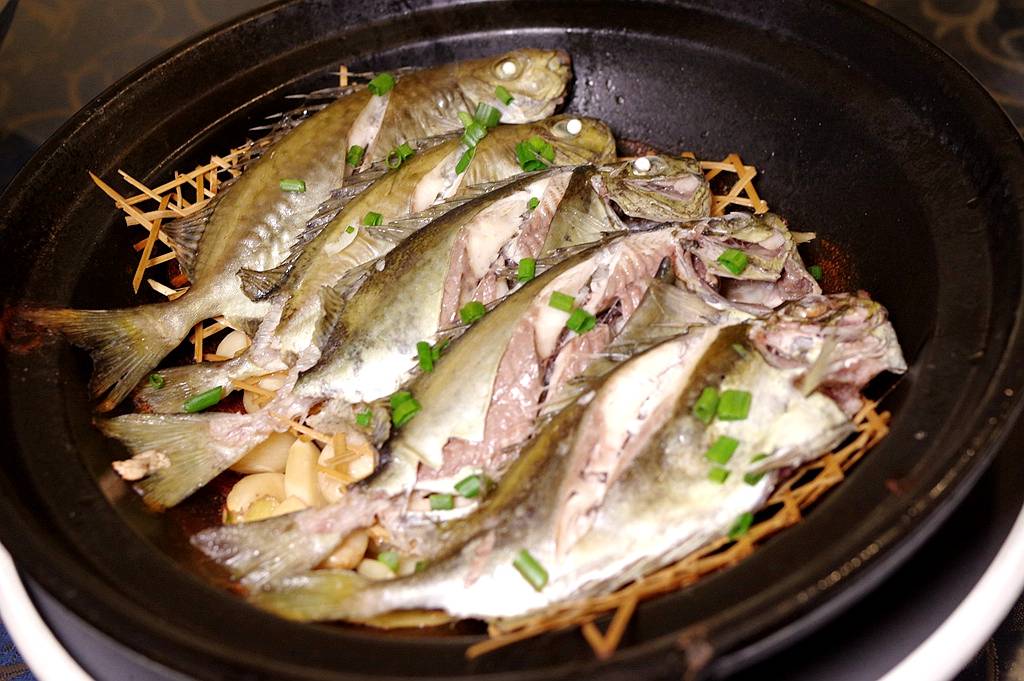 盐水焗臭肚鱼:这种又名“泥猛”“叶子鱼”的东西肚子一定要掏干净,不然会沾染到鱼肉带有腥苦味,但是处理好了肉质不错,鱼味也浓,颇受饕客喜欢。盐水焗的做法本色出演就很好吃。