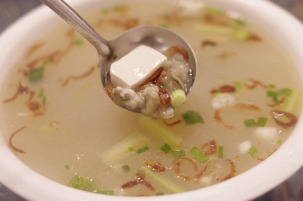 有原浆啤酒,按说不用汤。但是朋友聚会嘛,总会有人顺手拎点啥,于是弄个清淡的海蛎豆腐汤解酒。