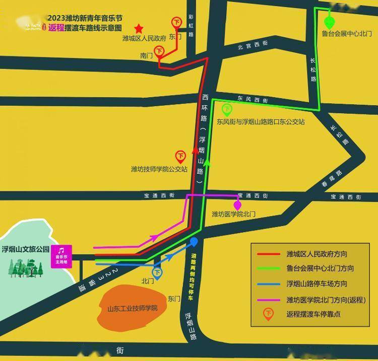返程过程中还有一条直达潍坊医学院北门(宝通街)的摆渡车路线,从活动现场直达摆渡车统一停放于浮烟山文旅公园山门路主路右侧,将乐迷送回4个集散点,中途设置摆渡车停靠点,方便乐迷就近下车: