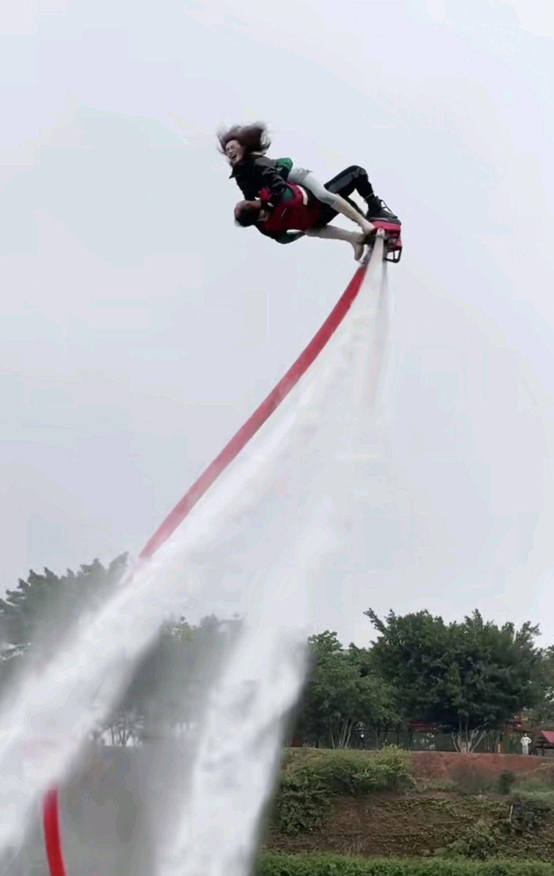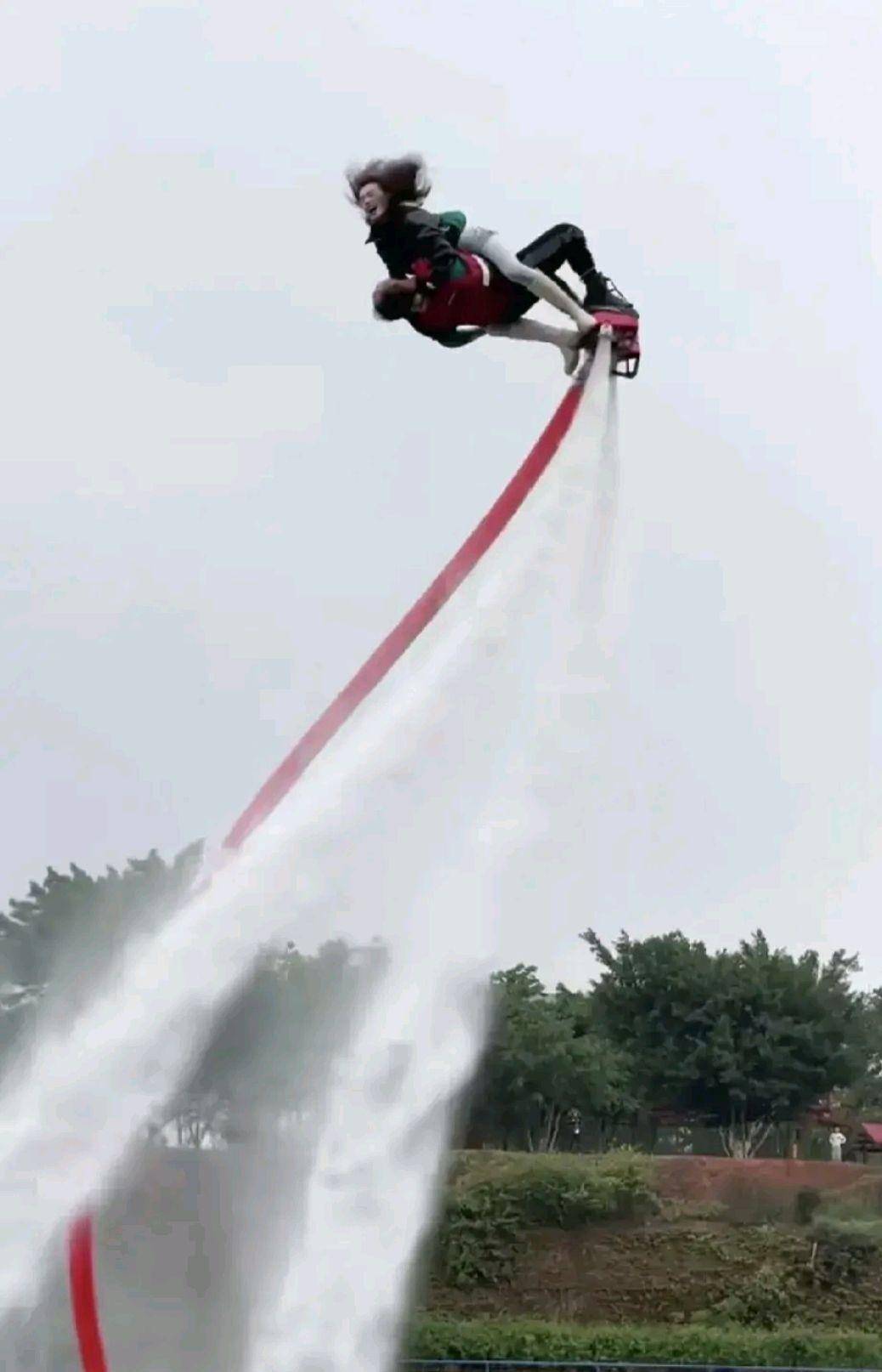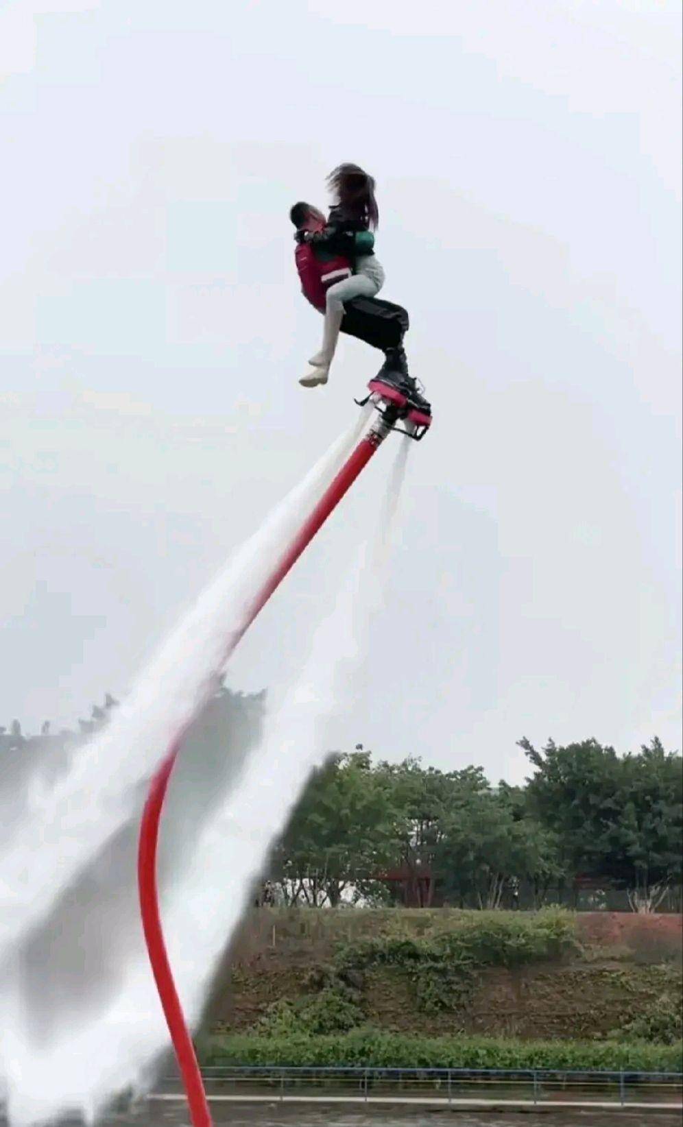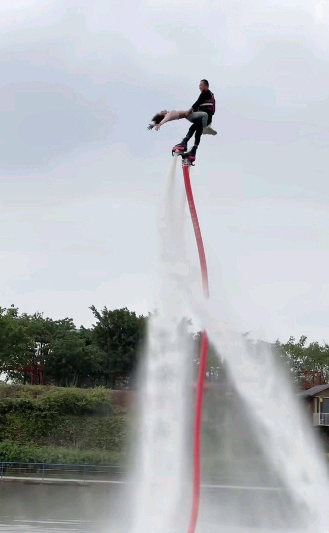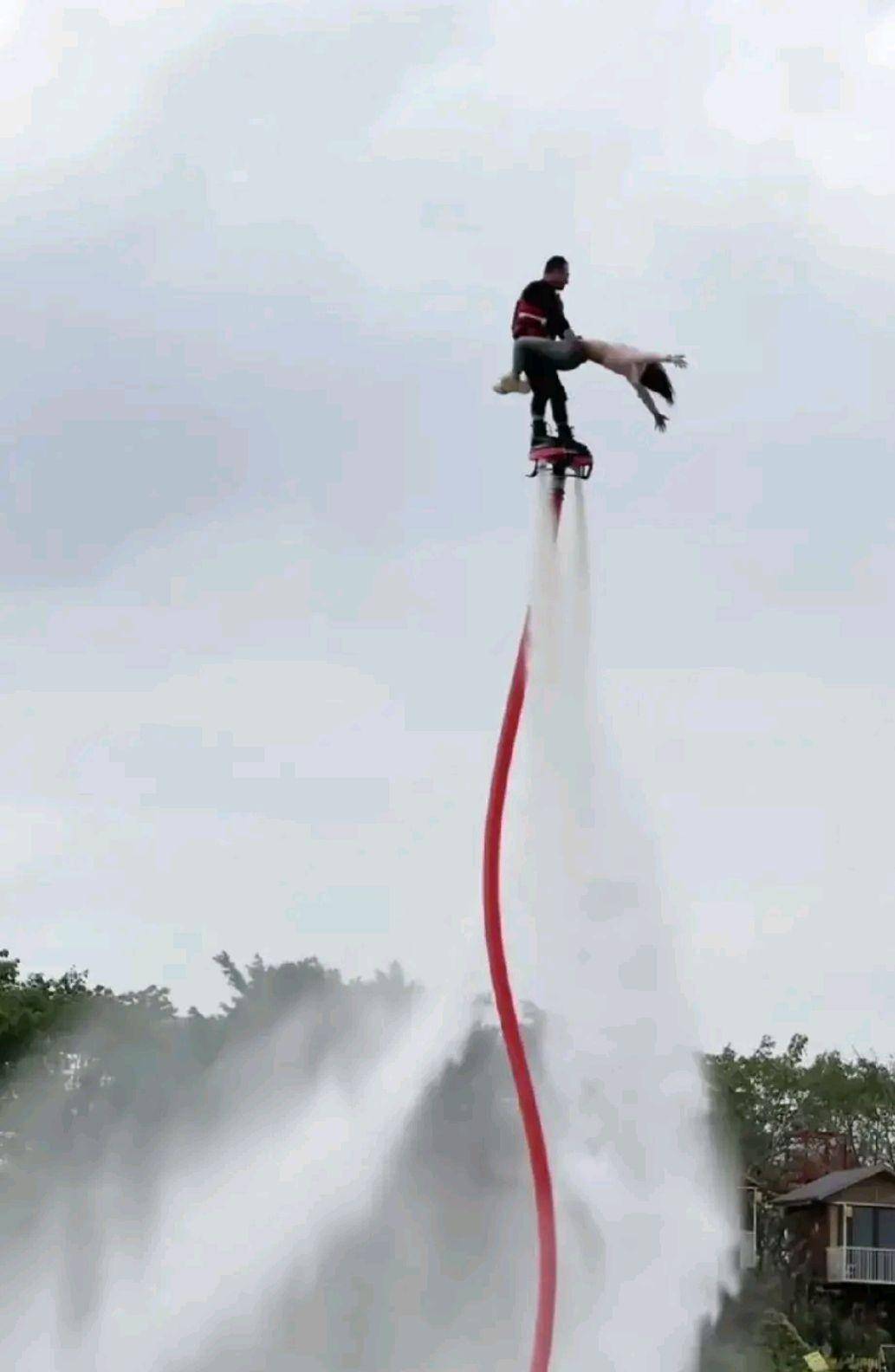 水上飞行表演,表演者双脚站在向下喷水的踏板上,水柱将人向上顶起,人在空中时而加速上升,时而急速翻滚,时而加速下降,还能在空中竖直悬停…