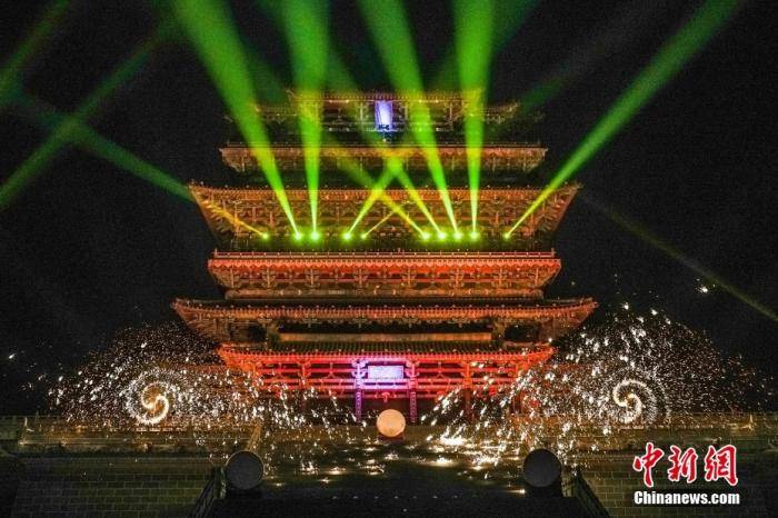山西运城永济市,打铁花表演在鹳雀楼景区上演。中新社记者 武俊杰 摄