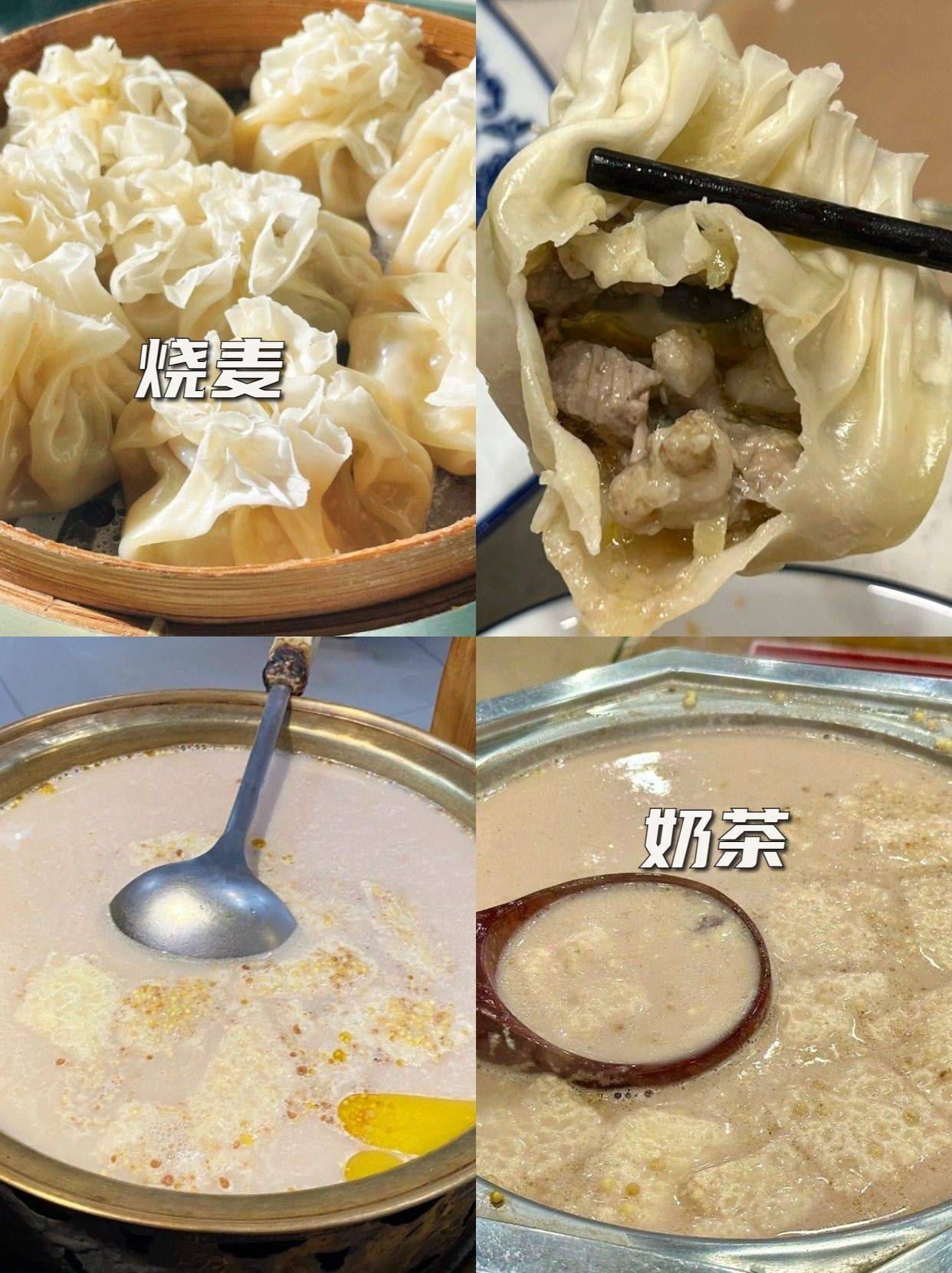 烧麦&奶茶:蒙格勒蒙餐、额尔敦涮肉,烧麦和奶茶可以搭配在一块作为蒙式早餐,内蒙的奶茶是咸口的,可能一开始不会太适应,但只要多尝两口就一定会爱上的!奶味香醇、牛油咸香,里面再泡几块奶豆腐,热乎乎的喝下去可太舒服了!烧麦有蒸的和油煎的,我比较喜欢煎的,焦焦脆脆的,爱了~
