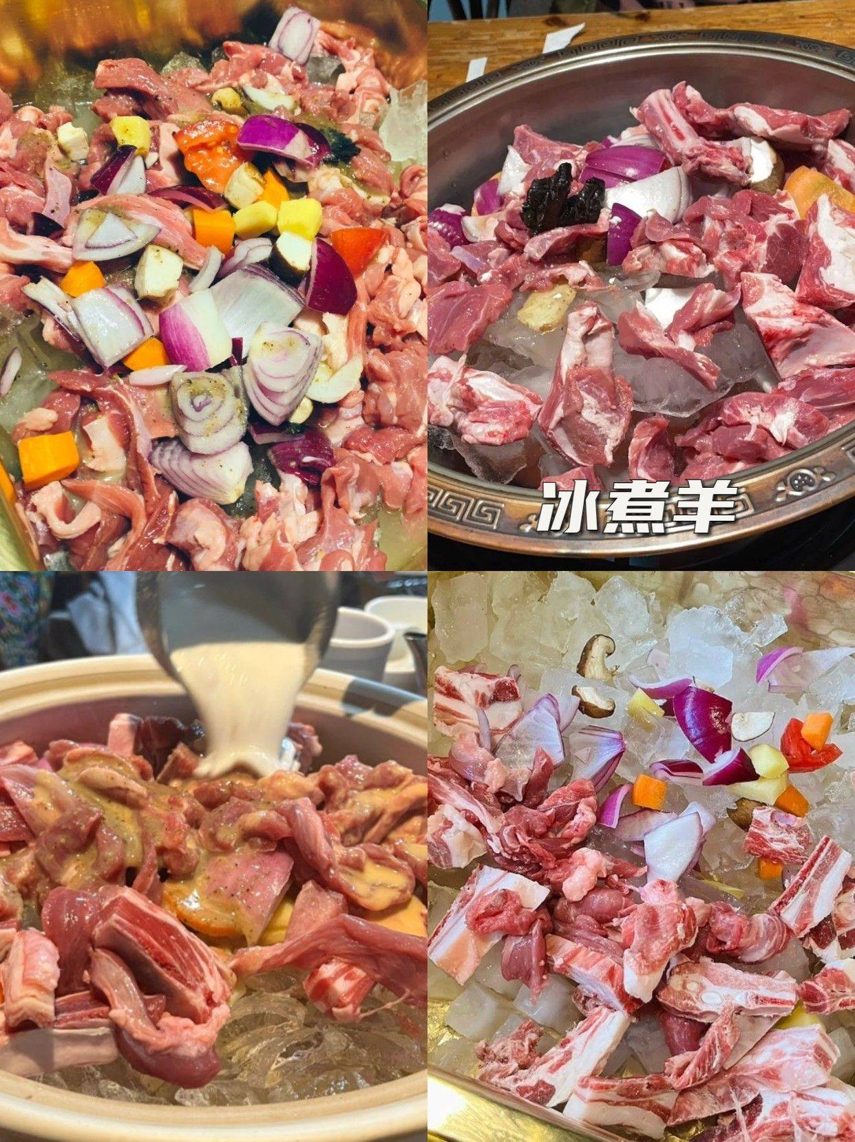 冰煮羊:泽成冰煮羊、冰煮羊是内蒙的特产火锅,直接用天然泉水冻成的冰块加羊肉、羊排、洋葱、番茄、土豆、胡萝卜块盖盖煮到沸腾,这样煮出来的羊肉特别嫩!再配上秘制蘸酱,蘸酱有香辣和麻酱两种,都特别好吃!