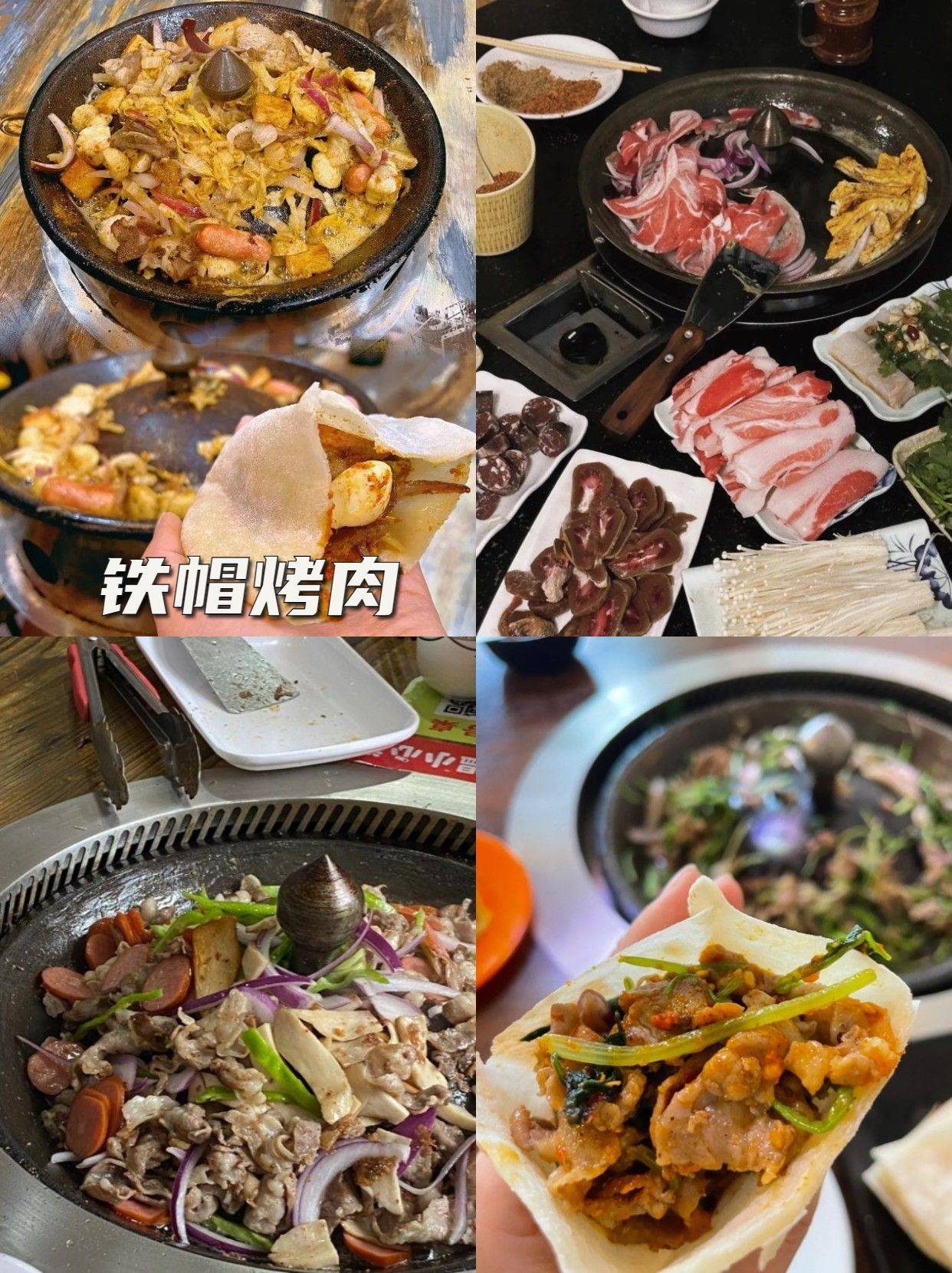 铁帽烤肉:君王铁帽烤肉、阿牧尔传统铁帽烤肉,之所以叫铁帽烤肉是因为烤肉的锅是仿制蒙古士兵头盔做成的,这样能够保证烤肉受热均匀,再加上当地羊肉本身肉质就特别鲜嫩,撒上蘸料,用当地特色的马褡饼一卷吃起来简直太绝了!