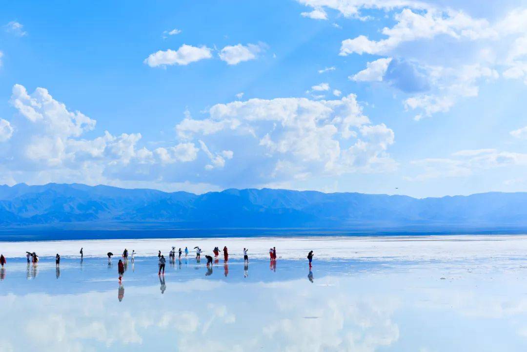 茶卡盐湖,海拔3059米,景区面积30平方公里。湖面辽阔空旷、地势平坦,具有强烈的镜面反射能力,家长和小朋友们要注意戴好墨镜哦!“水映天、天接地、人在湖间走、宛如水中游”,被称为“中国的天空之境”。