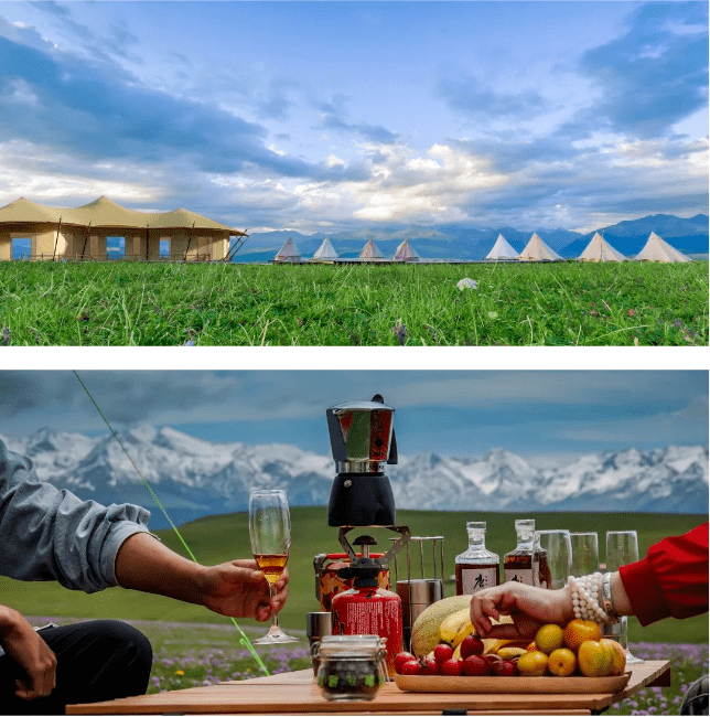 孩子体验的同时我们也给家长们准备了 【雪山牧场下午茶】,在天幕帐篷下,吹着草原上的风、看着雪山、享受静谧草原度假时光!