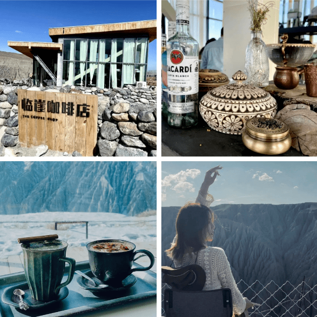景区内有 著名的非遗文化-达瓦孜高空表演(有演出时间),还有 新疆首家【临崖咖啡馆】,坐落于峡谷之巅,落地玻璃和简约木房,屋里是原木桌椅,咖啡味道不错, 拍照打卡都很nice!如果有需要可以去喝,坐在窗边就能欣赏大自然的鬼斧神工!