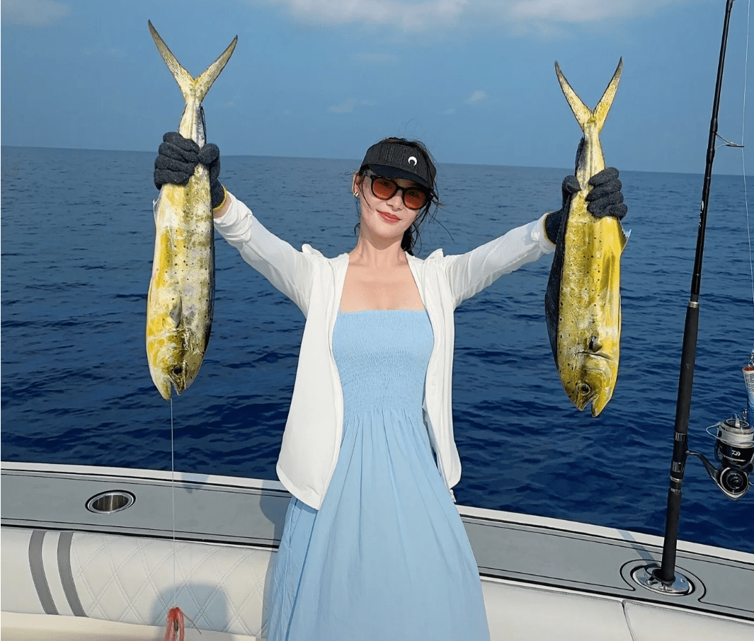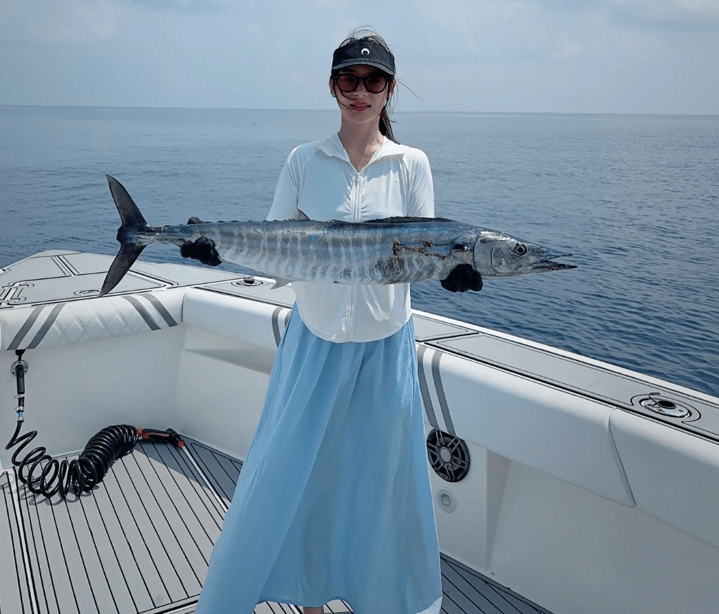 出海钓鱼当天,袁姗姗的look非常清新可人。她扎着高马尾,戴着墨镜,身穿蓝色吊带款式长裙搭配白色防晒衣,整体look像极了20出头的小姑娘,甜美又俏丽。袁姗姗张开双臂在船头灿笑,呼吸着海风,美景配美人,当真是美不胜收啊有木有。而且从这个角度看,袁姗姗的身材好好哦,时尚上位,小细腰吸睛十足,不愧是“运动女神”,身材从不拉垮。