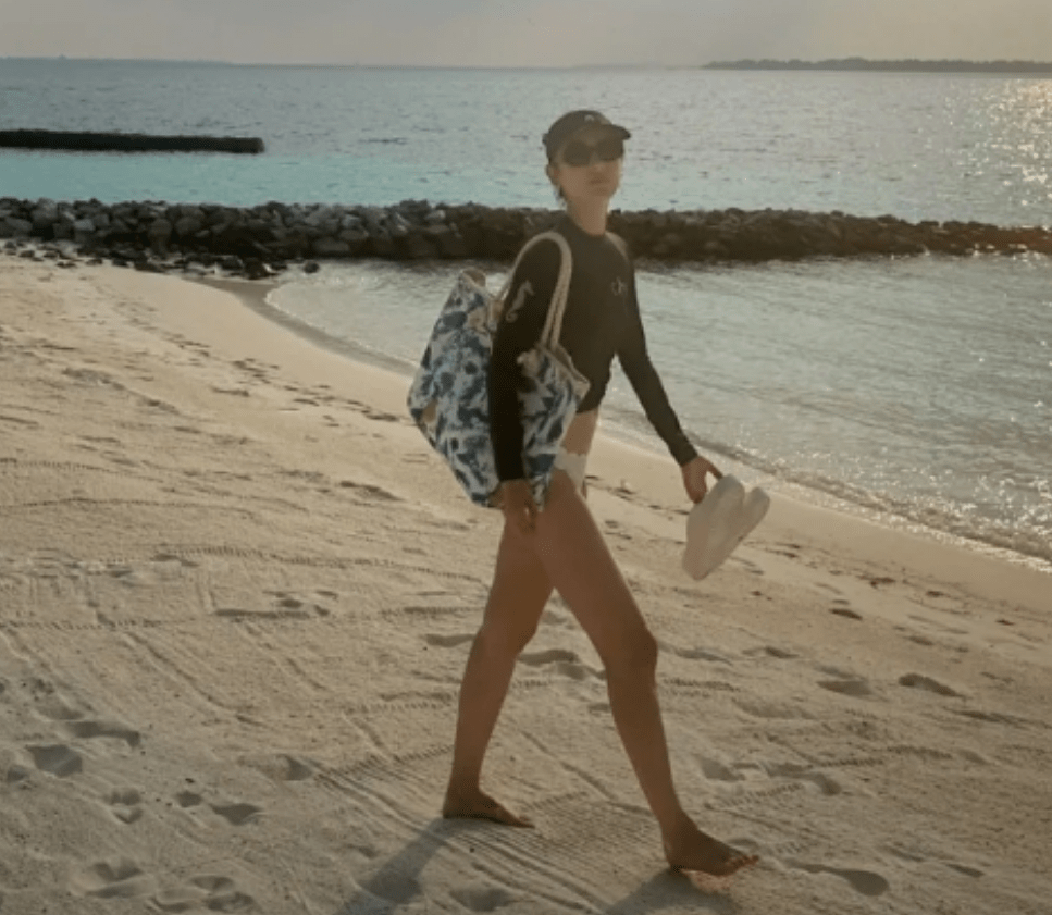 袁姗姗背着大包包,手里拿着拖鞋在海滩上漫步,穿着时尚的她大长腿好优越。