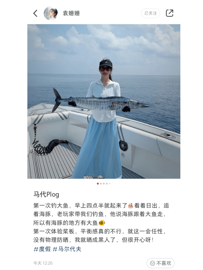 3月17日,演员袁姗姗在个人社交平台分享了一组在马尔代夫旅行的美照。袁姗姗还开心发文称早上四点半就起床去钓鱼,还看了日出。除此以外,袁姗姗还体验了一把浆板,她打趣自己平衡不行,但还是玩得很开心。文末,袁姗姗笑称自己没有做物理防晒,已经晒成了国外,莫名可可爱爱啊。