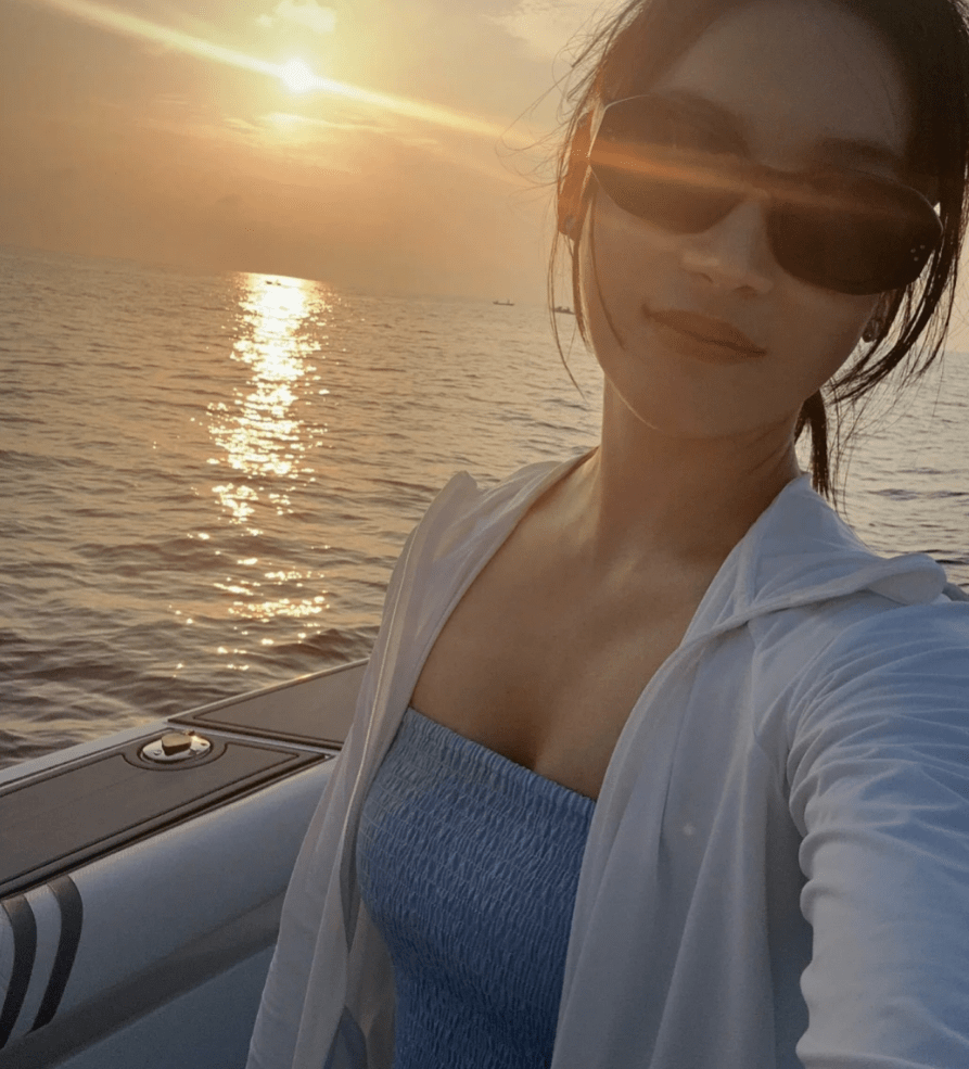 袁姗姗掌镜拍下和夕阳的合影,她对着镜头微微浅笑,即便戴着墨镜,依旧能够感受到她的好心情。