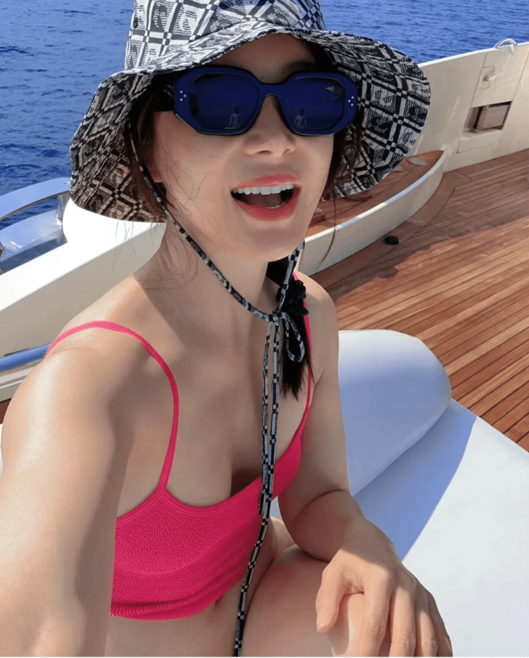袁姗姗还换了一套桃红色的时尚,而穿着这身显肤色的泳衣后,袁姗姗的手臂皮肤明显黑了几个度啊,哈哈哈。看来真如她所言,由于没有做屋里防晒,已经晒成“国外”了。