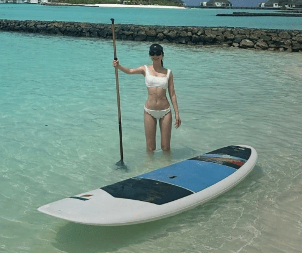 前面的发文里,袁姗姗提到自己体验了一次浆板,而她也大方po出了玩浆板的美照,令人惊喜的是,袁姗姗直接穿着时尚就出镜了,太辣啦。