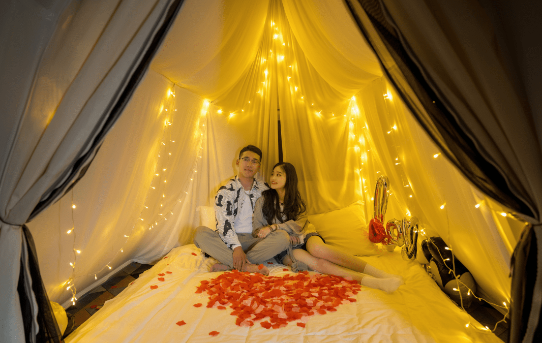 晚上,在满天星辰下,则有草坪蹦迪派对、萨朗晚会等活动,让游客能够尽情享受歌舞,露天烧烤、烛光晚餐等美食,能让游客享受舌尖上的愉悦,更有520定制露营帐篷,为这个520夜晚浪漫氛围加持,留下专属你们的美好记忆。