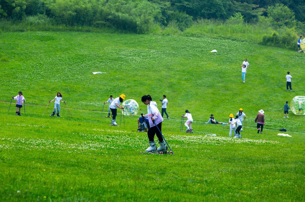 位于后山的滑草场也能让游客拥有全新的运动体验。春季充足的阳光和雨水,让九皇山滑草场里的草坪生长的茂盛青翠。游客们在这里可以免费体验滑草项目,感受在城市里无法体验到的清新空气与自由自在。