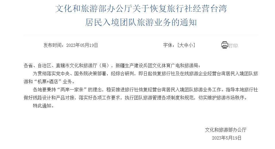 通知表示,经综合研判,即日起恢复旅行社及在线旅游企业经营台湾居民入境团队旅游和“机票+酒店”业务。