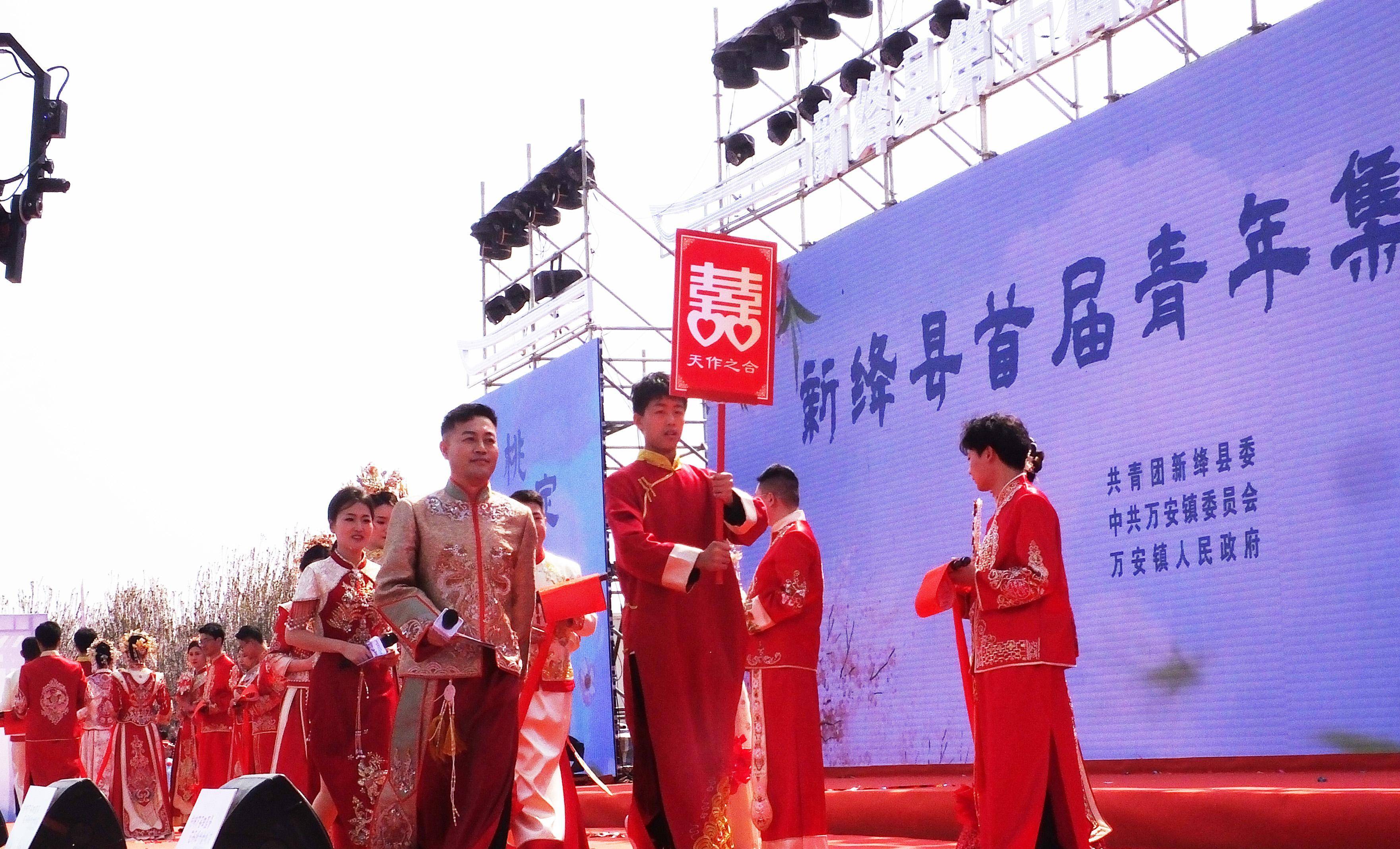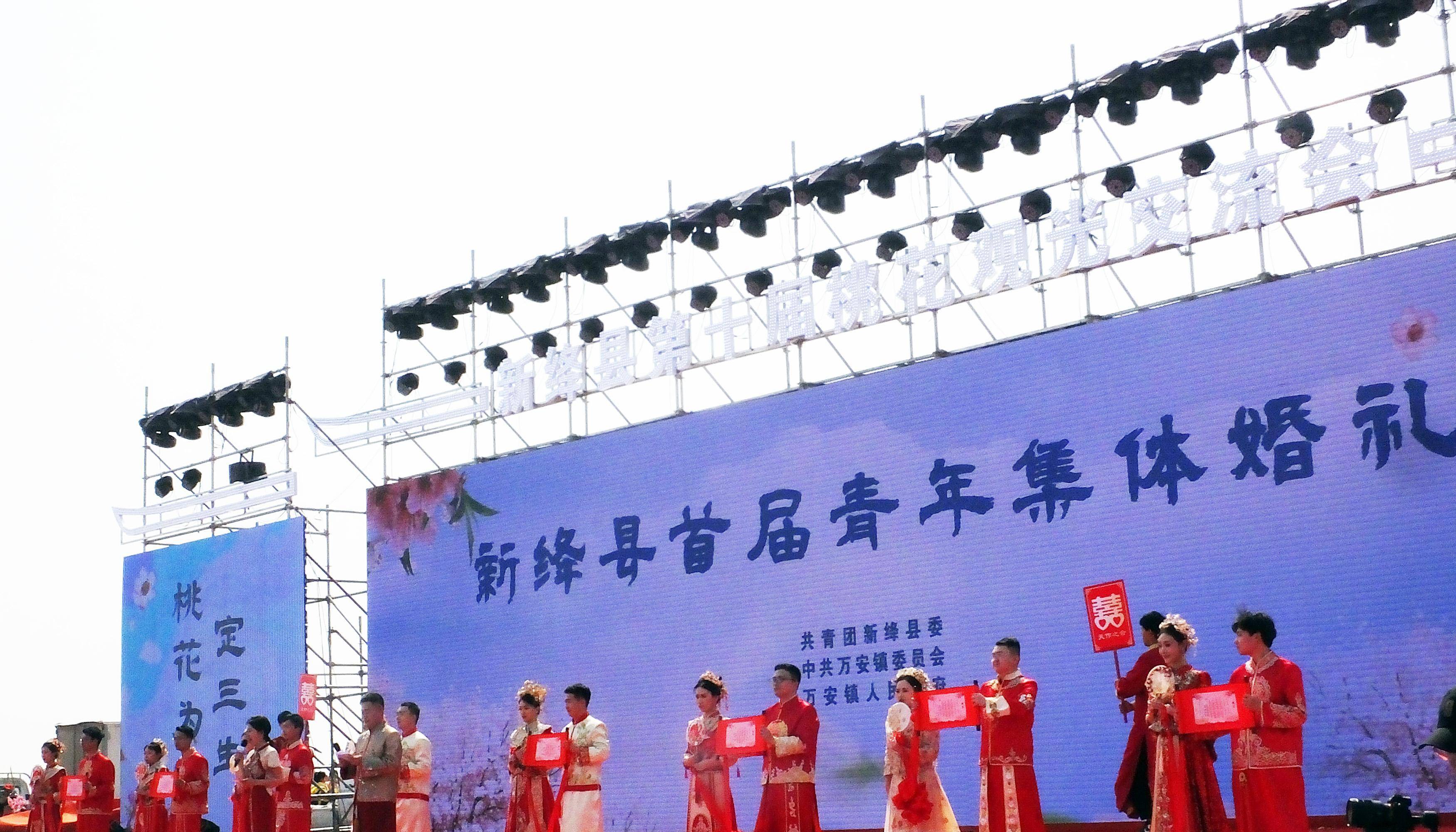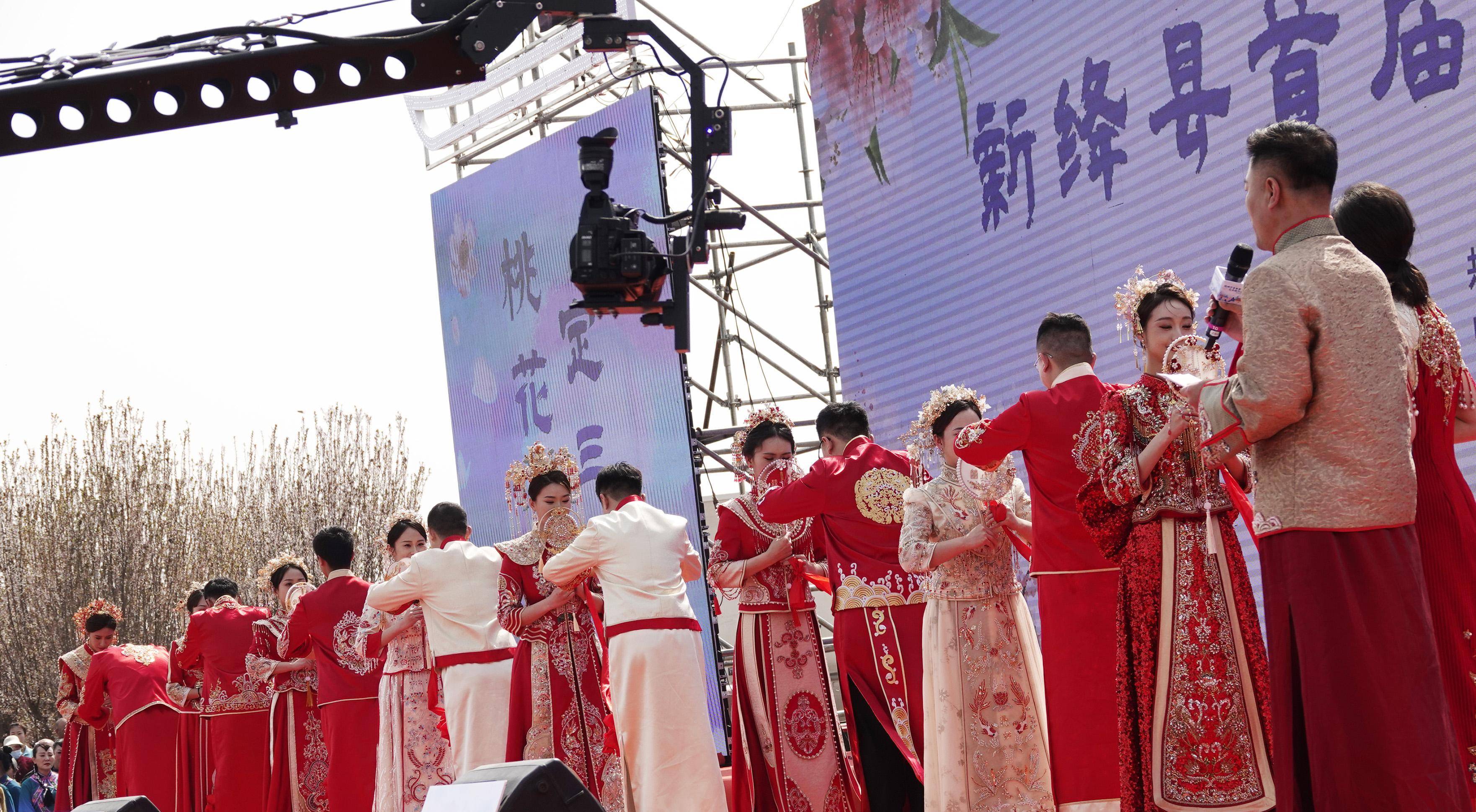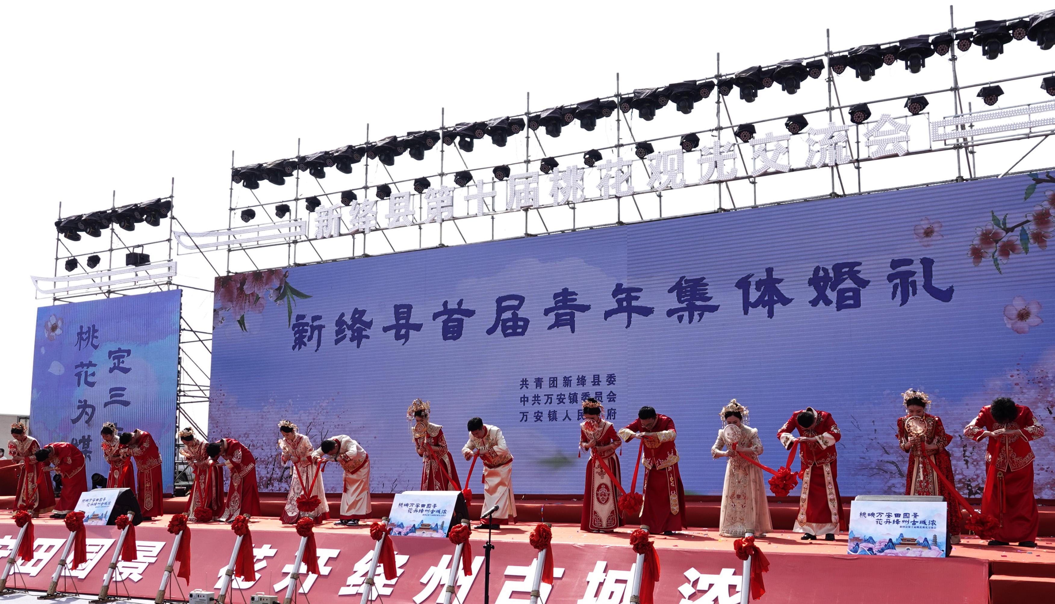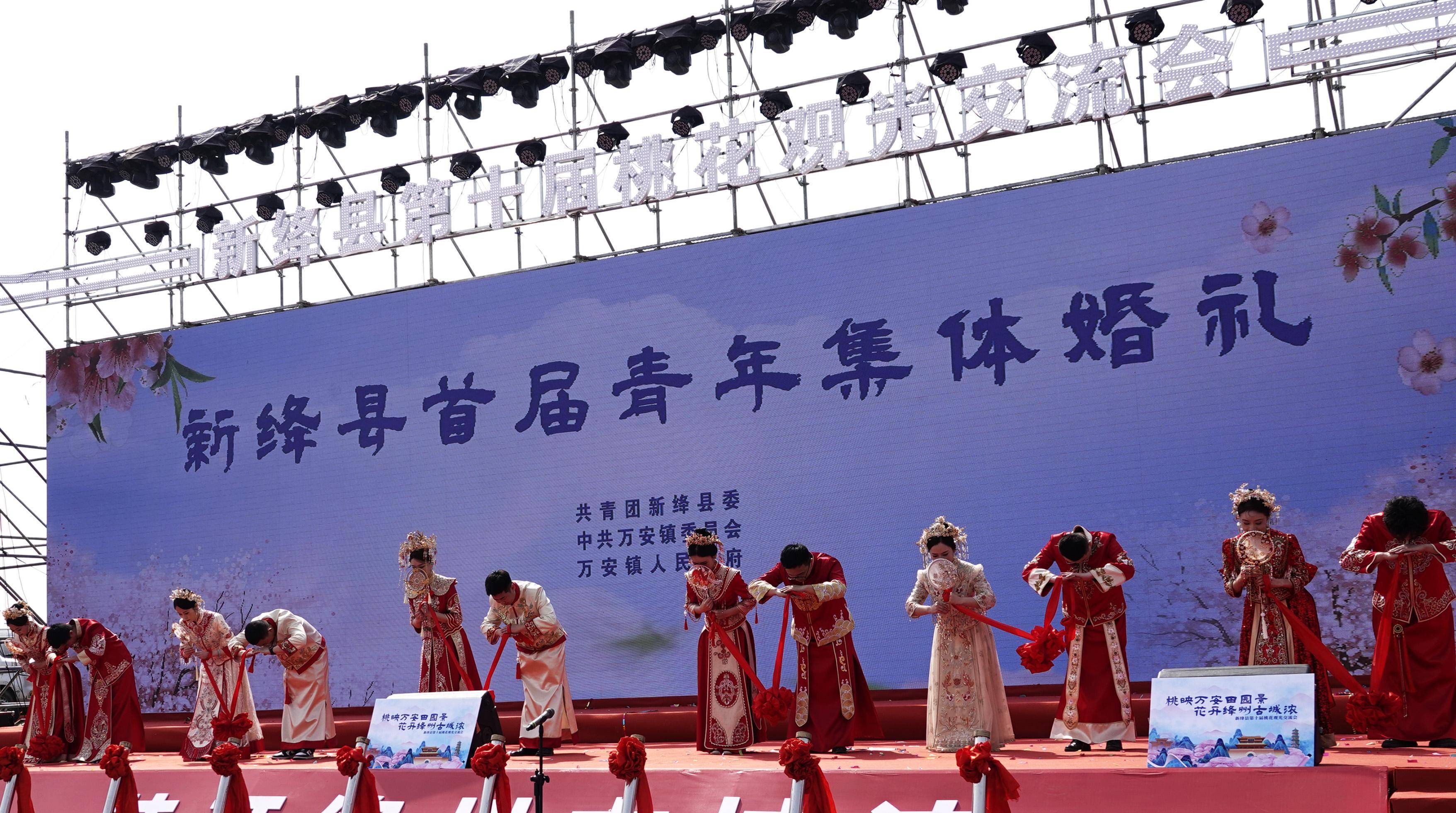 在山西运城市新绛县第十届桃花观光交流会开幕仪式上,八对新人参加首届青年集体婚礼