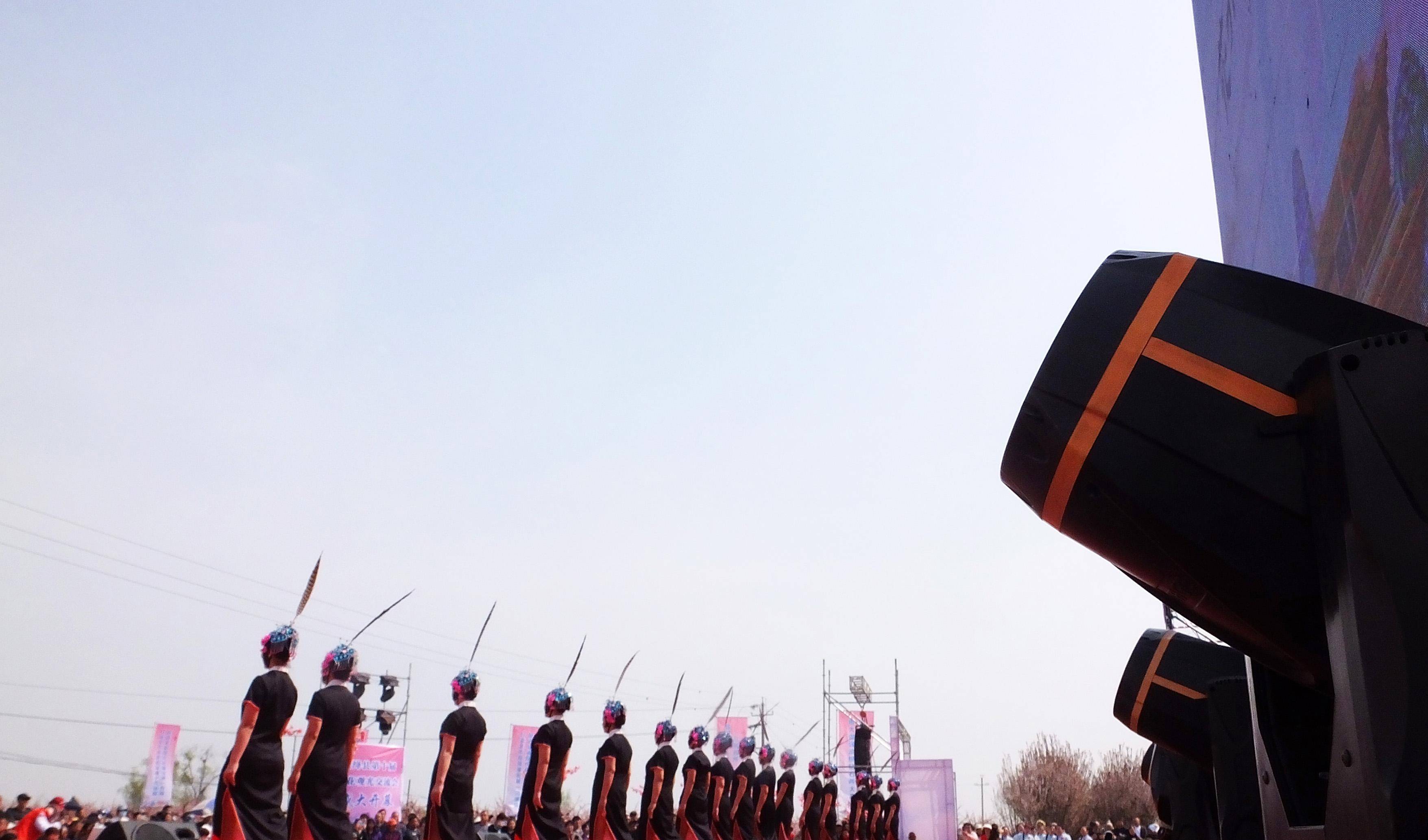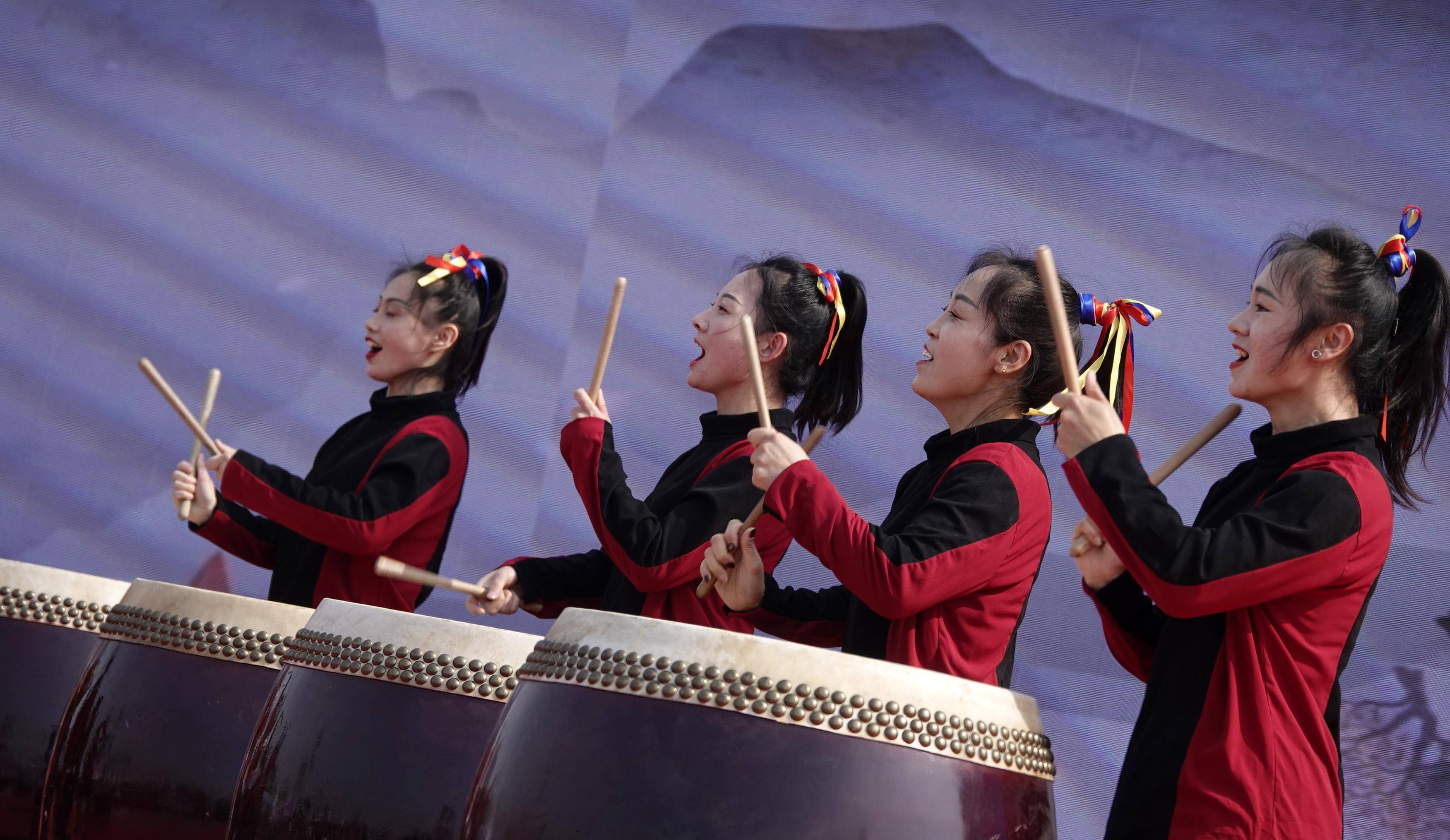 鼓乐手在山西运城市新绛县第十届桃花观光交流会开幕仪式上演绎国家级非遗绛州鼓乐经典曲目