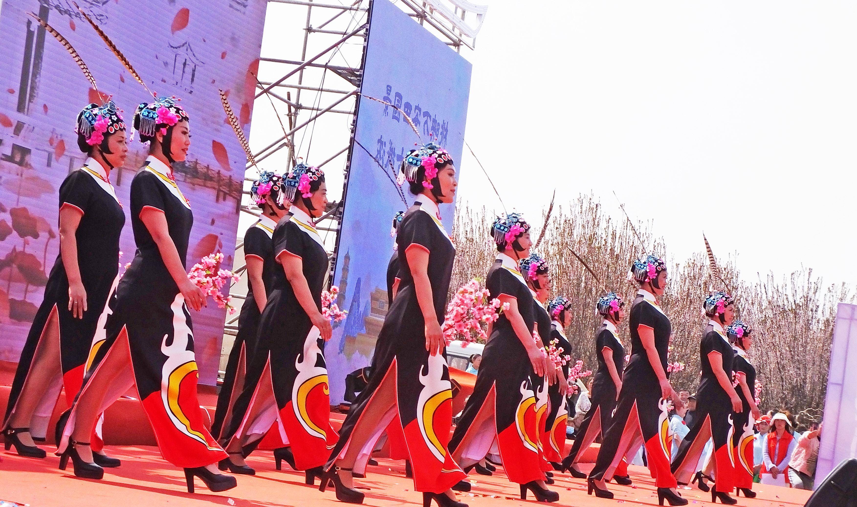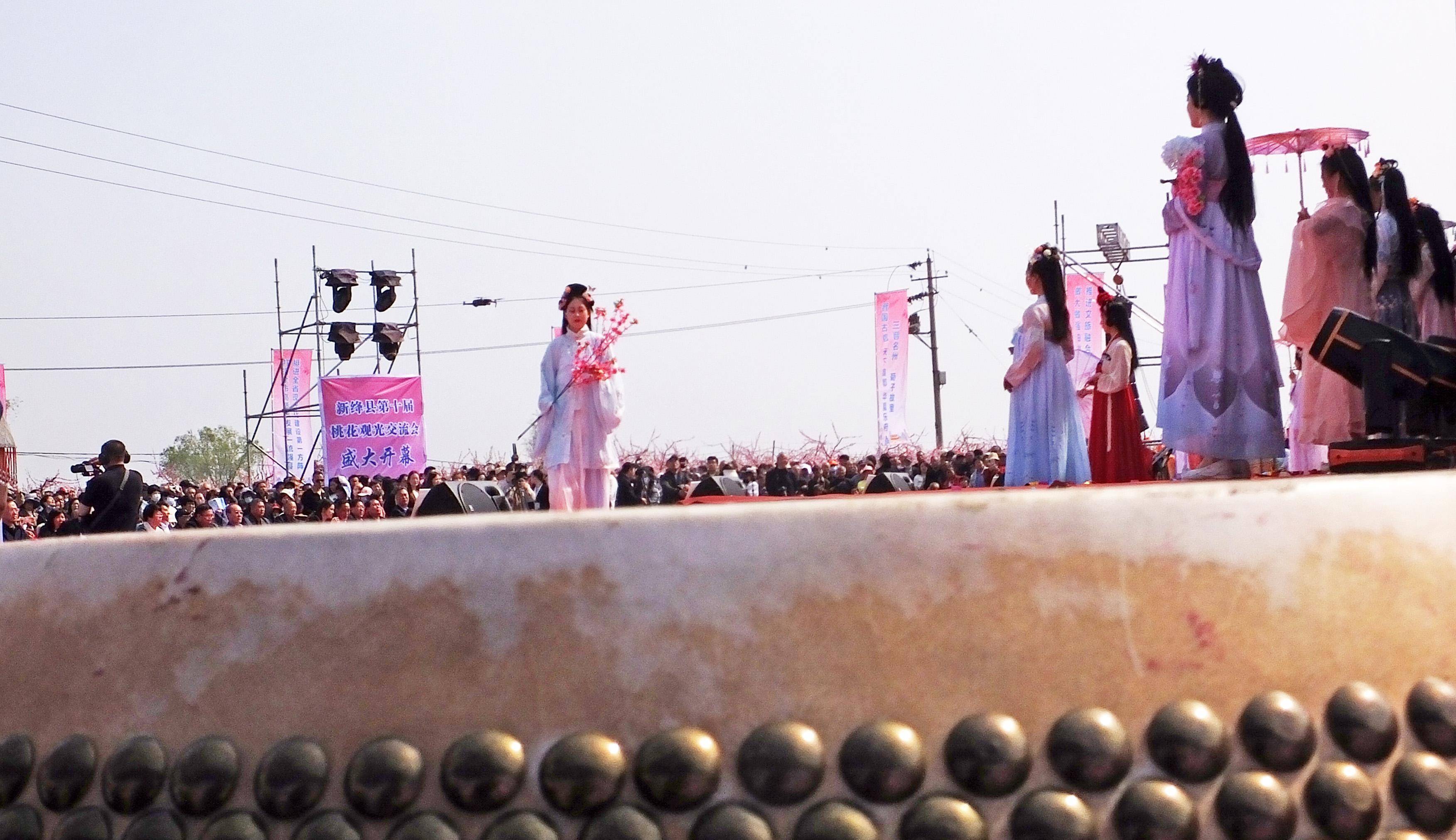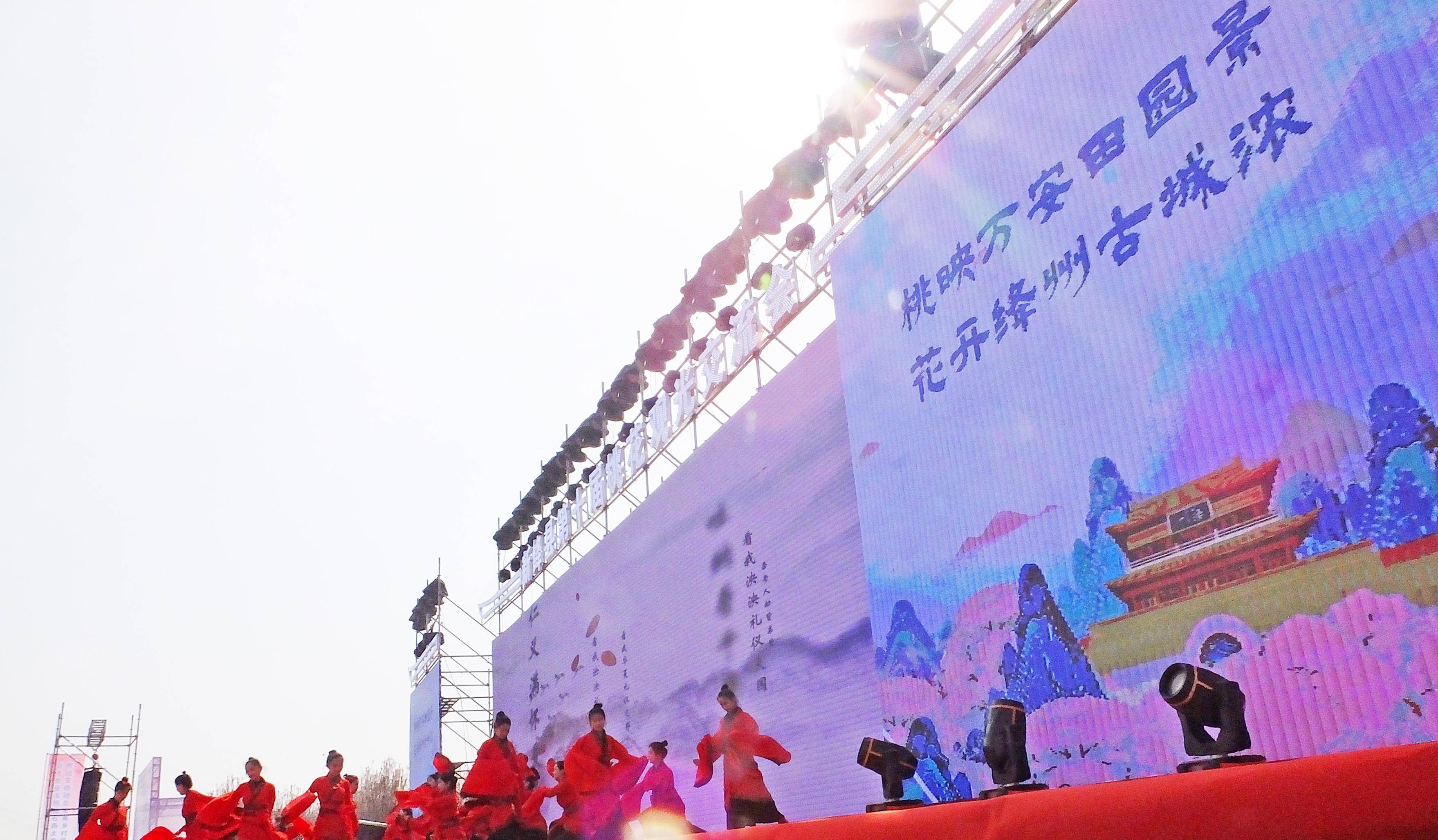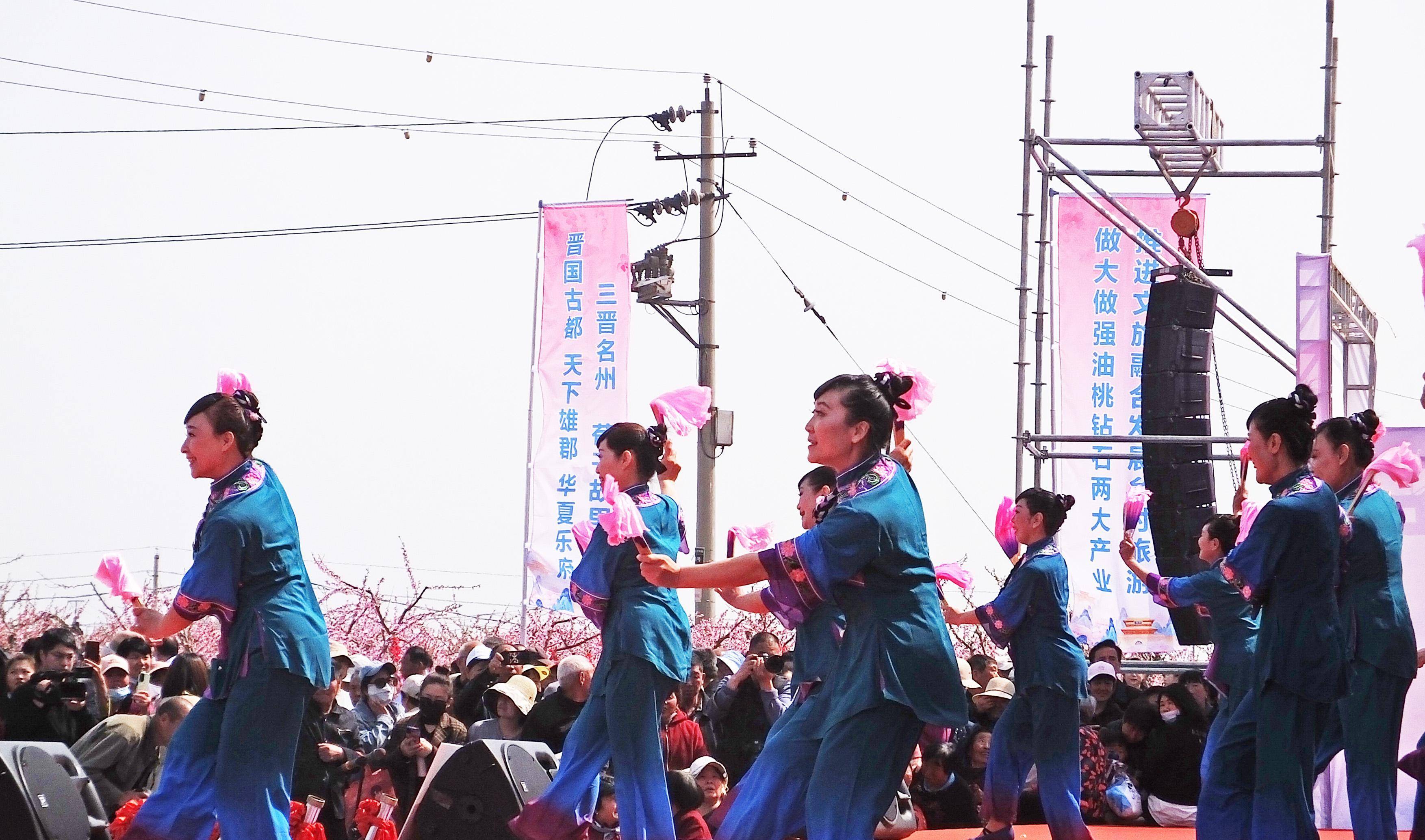 在山西运城市新绛县第十届桃花观光交流会开幕仪式上,文艺工作者在表演歌舞桃花朵朵
