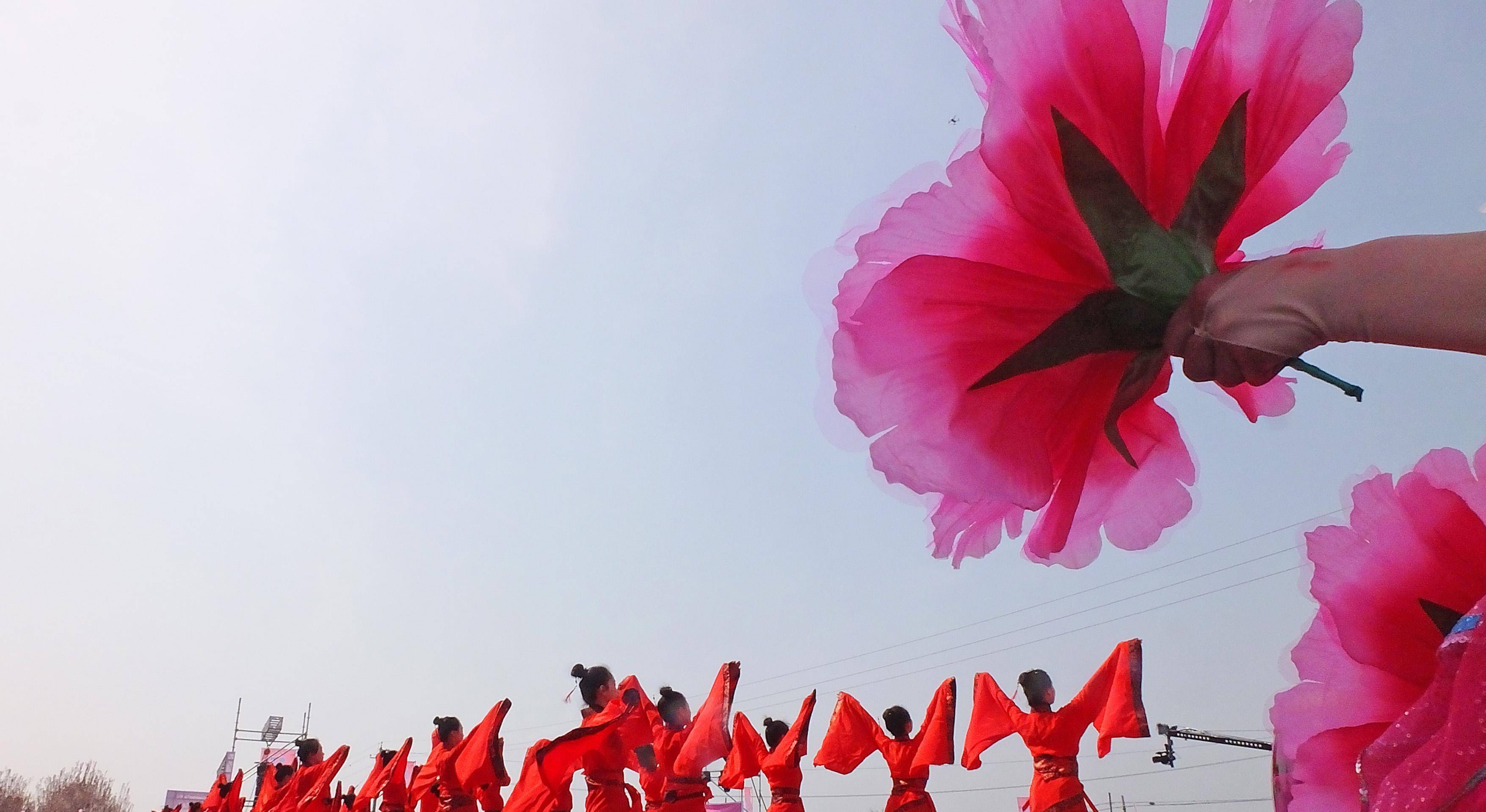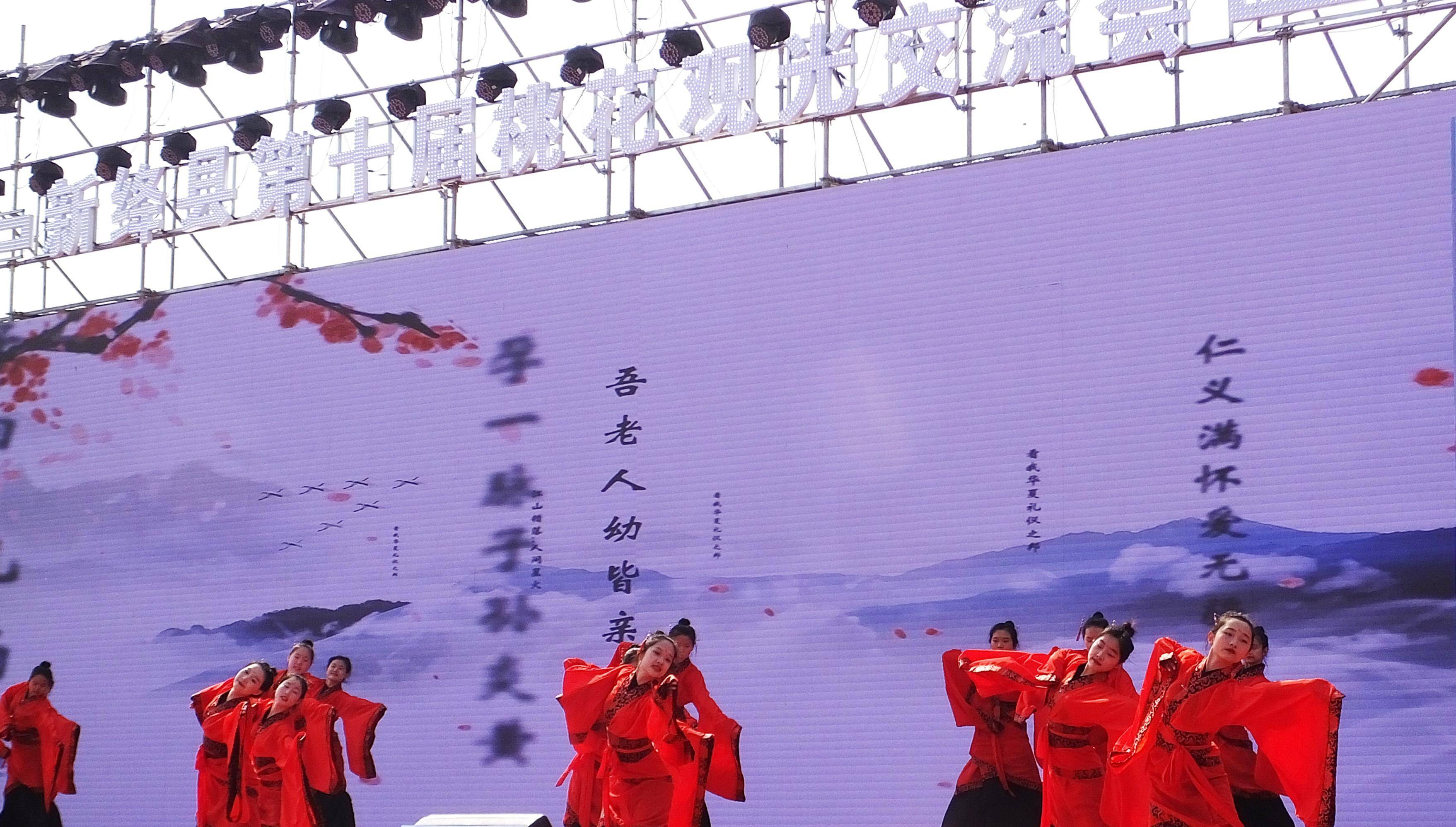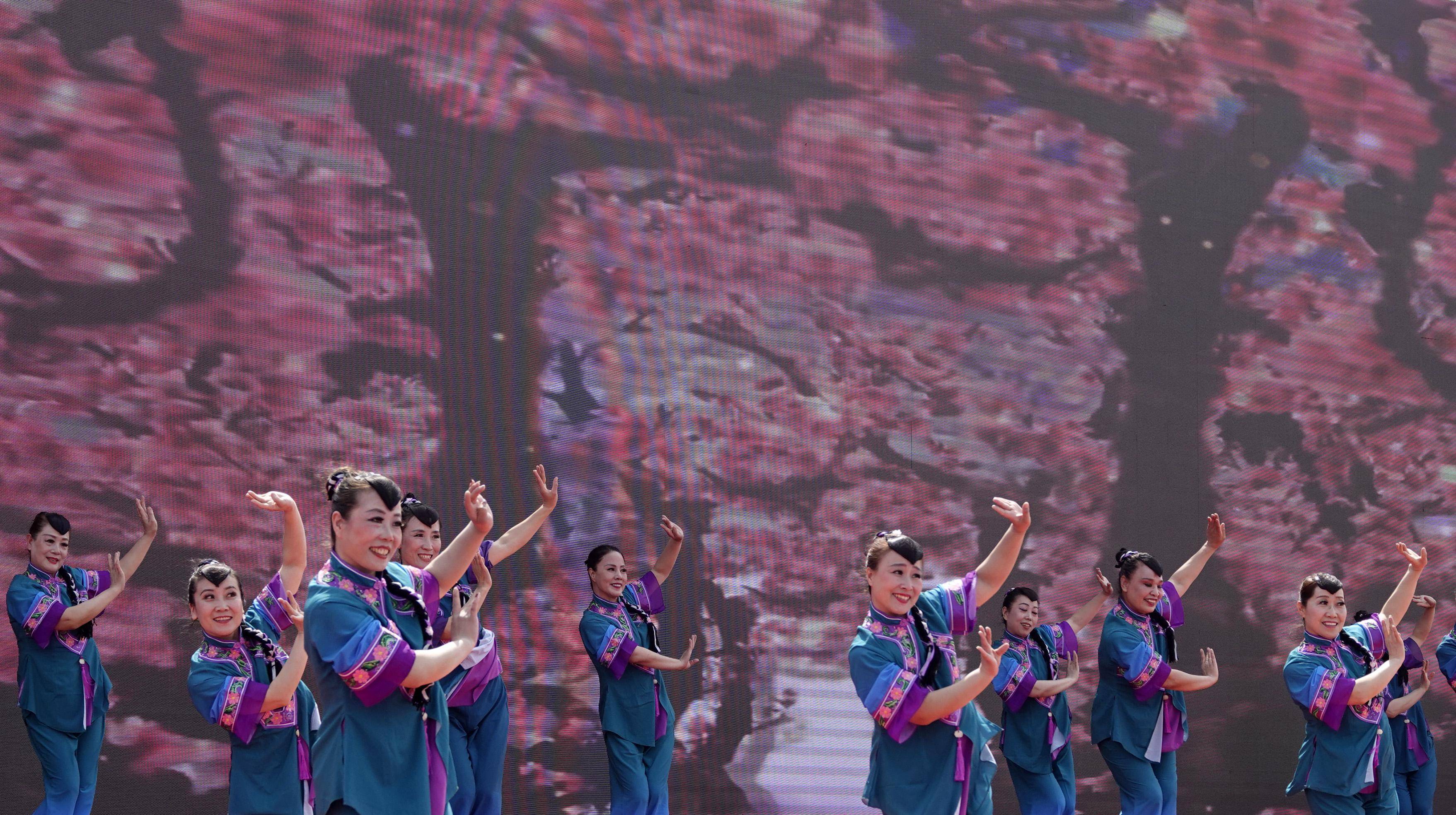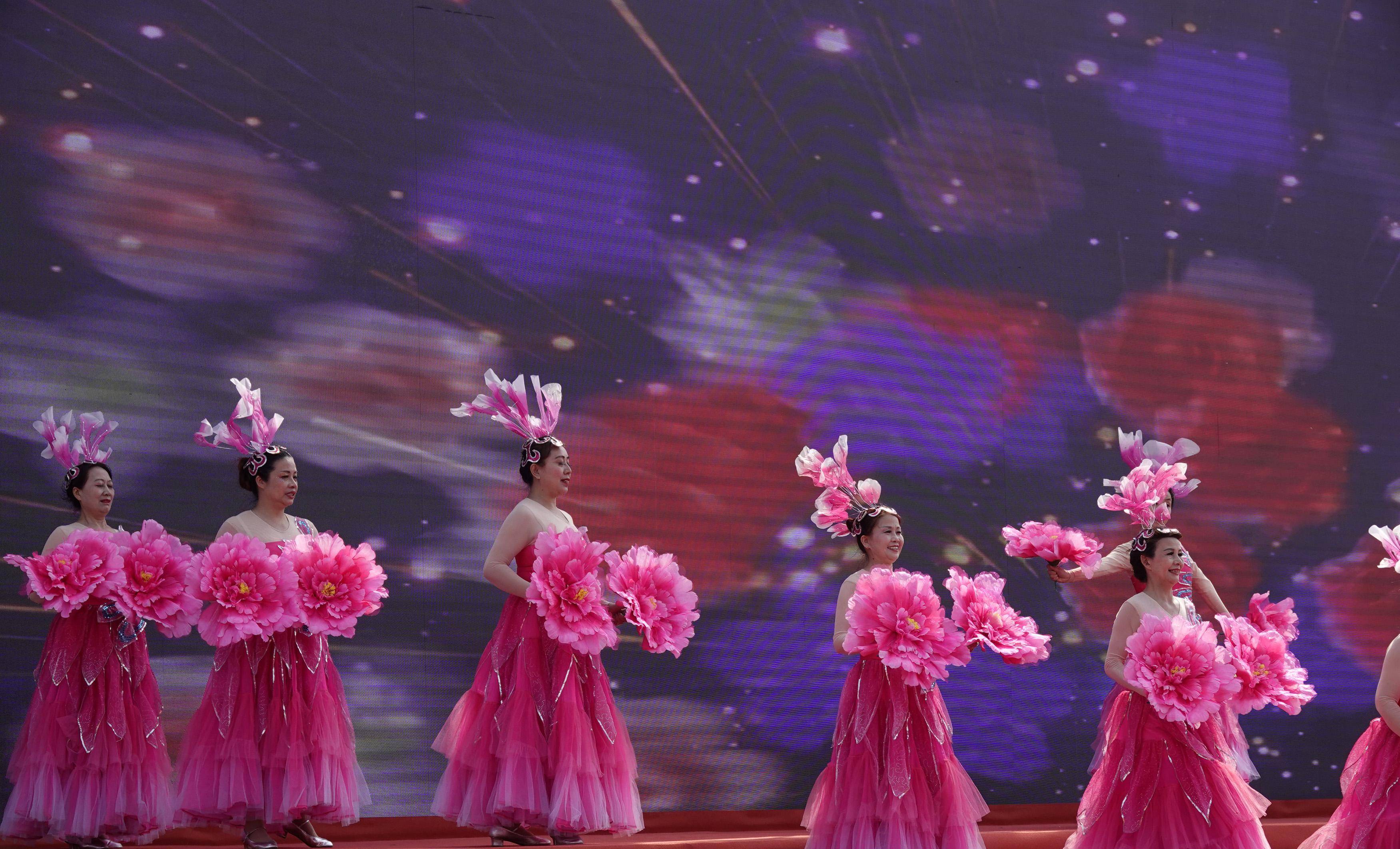 在山西运城市新绛县第十届桃花观光交流会开幕仪式上,文艺工作者在表演歌舞桃花朵朵