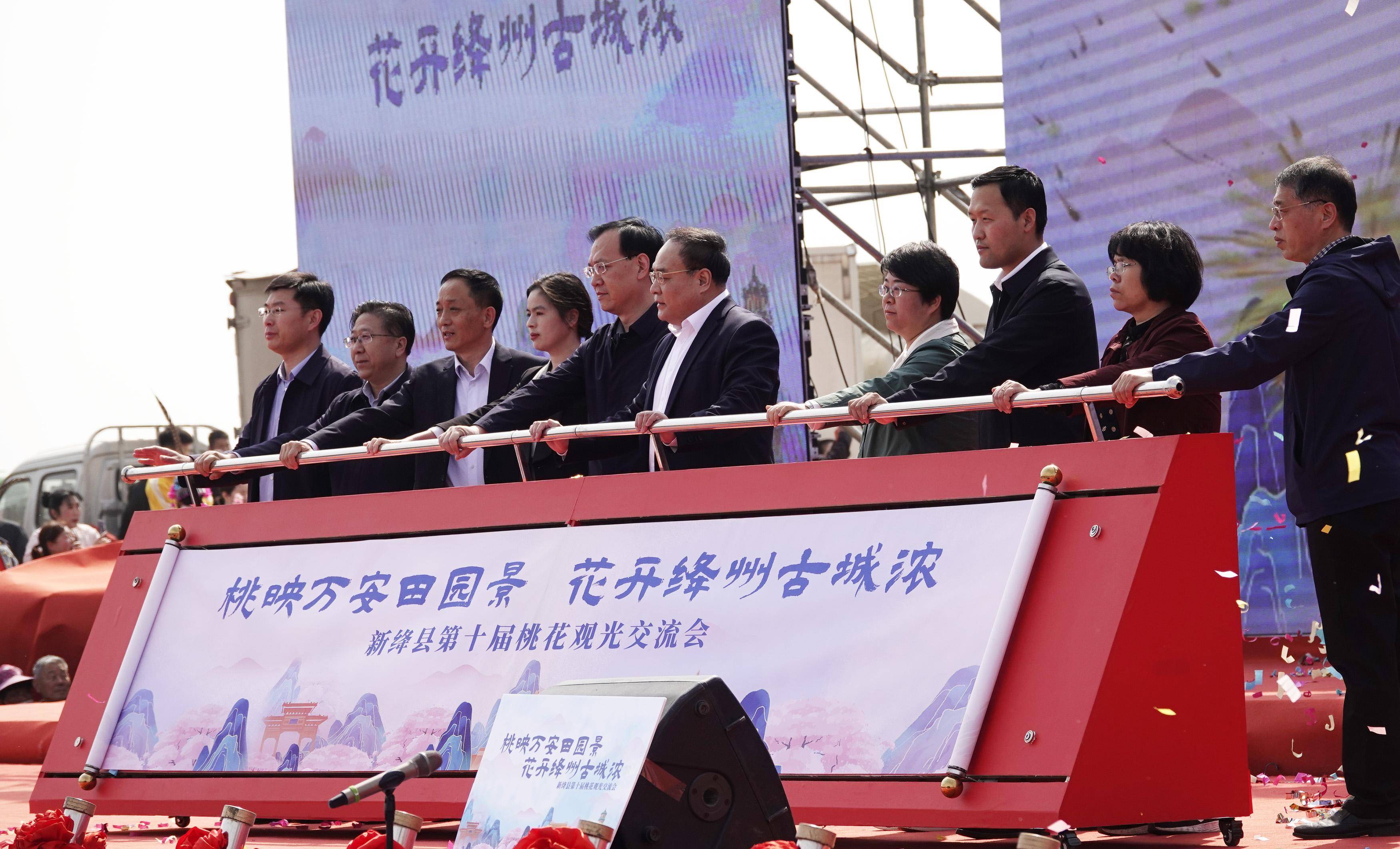 嘉宾在山西运城市新绛县第十届桃花观光交流会上启动开幕仪式