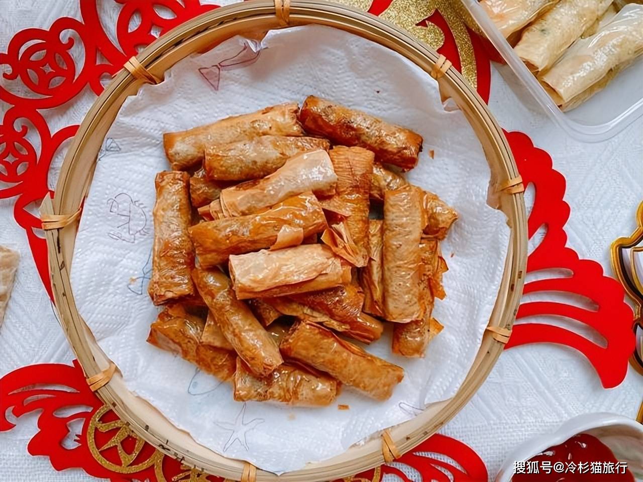 第四道是炸响铃,它的名字有点古怪,不知道的人还以为是一件物体。实则这是本地传统名菜。它的食材就是常见的豆腐皮,将肉馅卷入其中,再经过油炸而成,咬一口会有铜铃般的声音。
