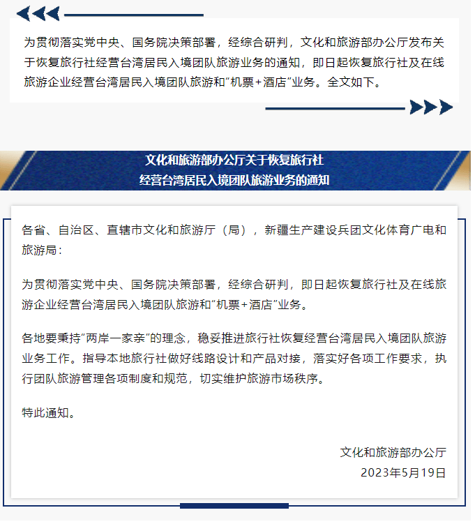 为贯彻落实党中央、国务院决策部署,经综合研判,文化和旅游部办公厅发布关于恢复旅行社经营台湾居民入境团队旅游业务的通知,即日起恢复旅行社及在线旅游企业经营台湾居民入境团队旅游和“机票+酒店”业务。全文如下: