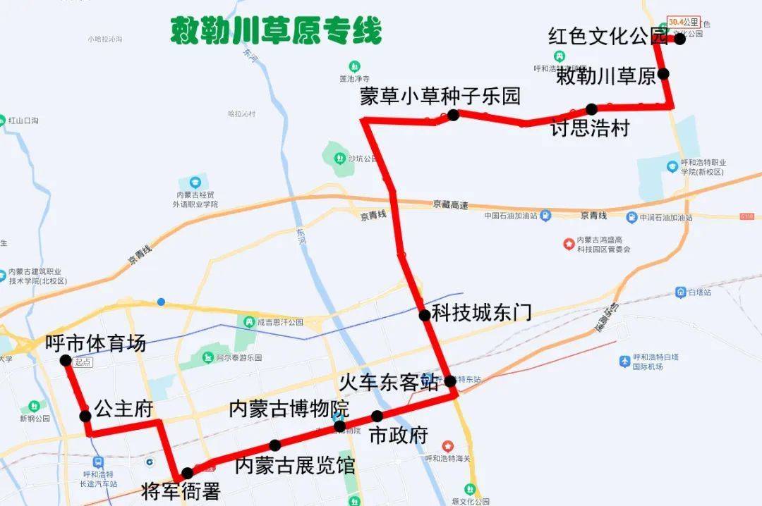 沿途设站:呼市体育场、多松年故居、公主府、将军衙署、内蒙古展览馆、内蒙古博物院、市政府、火车东客站、科技城东门、蒙草小草种子乐园、讨思号村、敕勒川草原、红色文化公园