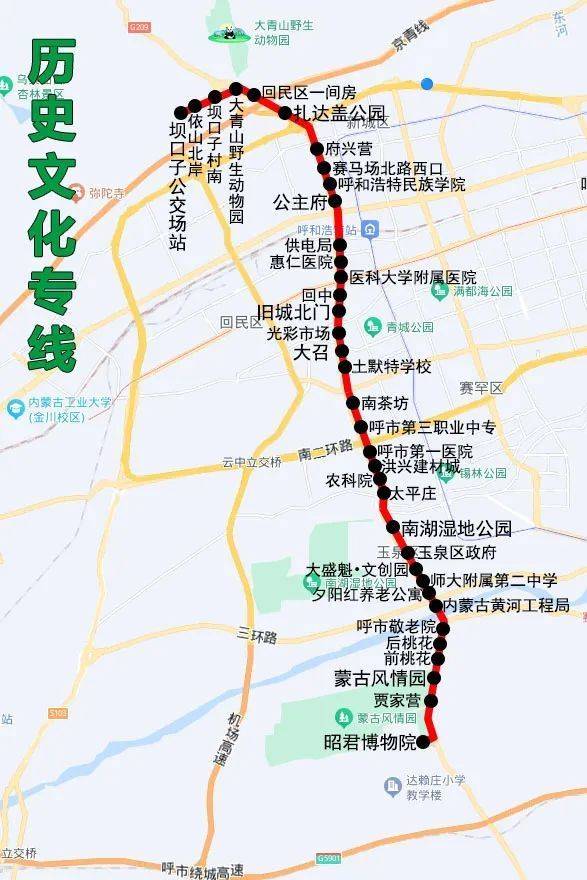 沿途设站:火车站、新华广场、清真大寺、青城公园、五塔寺、大召、南湖湿地公园、蒙古风情园、昭君博物院