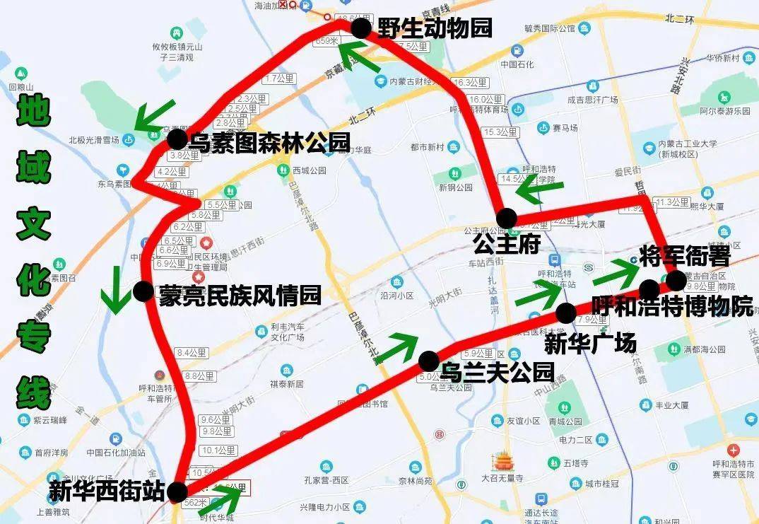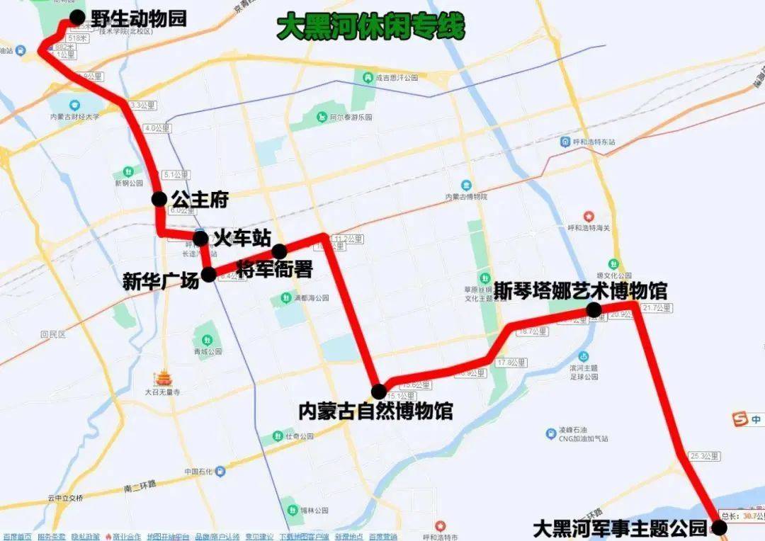 沿途设站:野生动物园、公主府、火车站、新华广场、将军衙署、内蒙古自然博物馆、斯琴塔娜艺术博物馆、大黑河军事主题公园