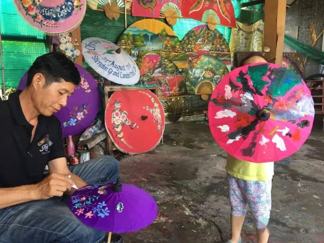 前往清迈有名的纸伞工艺村。纸伞村历史已经有200多年,最特别的是可以DIY手绘纸伞,在伞面上描绘上喜欢的图案,这样独特的体验大人小孩都爱玩,而且做好的纸伞还能带走,作为旅程里的一段美好纪念。