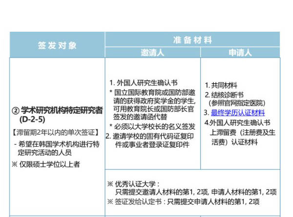 根据韩国大使馆2023年4月12日最新发布的“签证申请与准备材料指导”内容, D-2-5签证的签发对象及准备材料见下图。