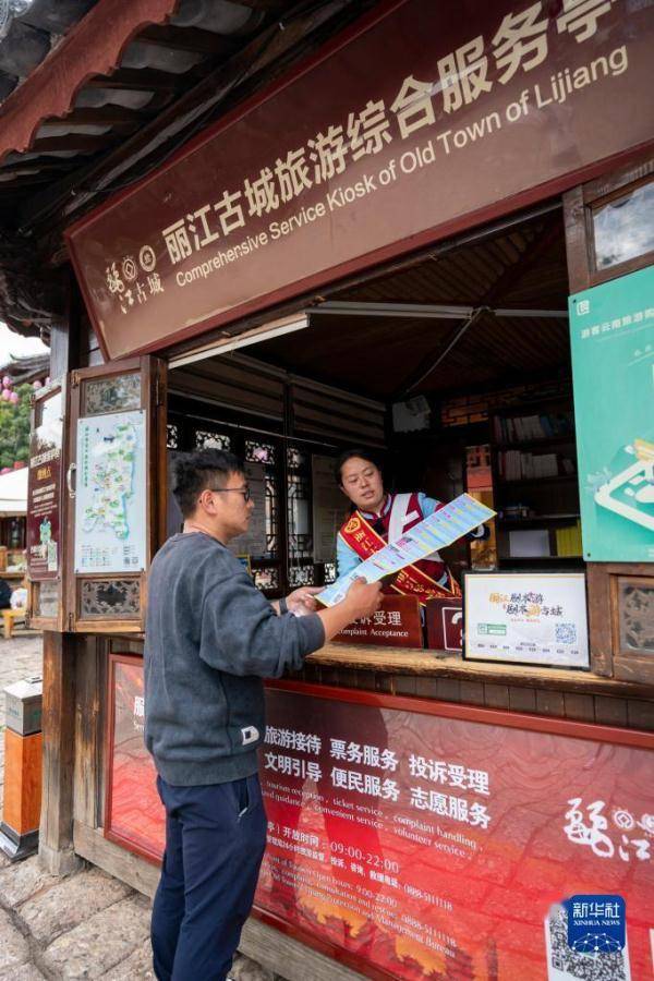 5月18日,一名志愿者(右)在丽江古城一处旅游综合服务亭为游客指路。