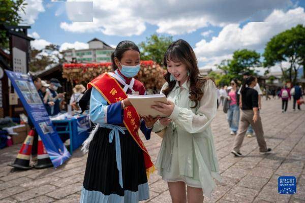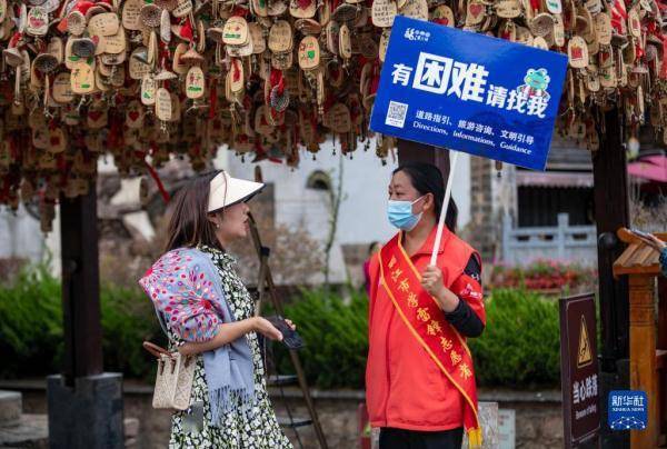 5月18日,一名游客(左)在丽江古城向一名志愿者咨询。