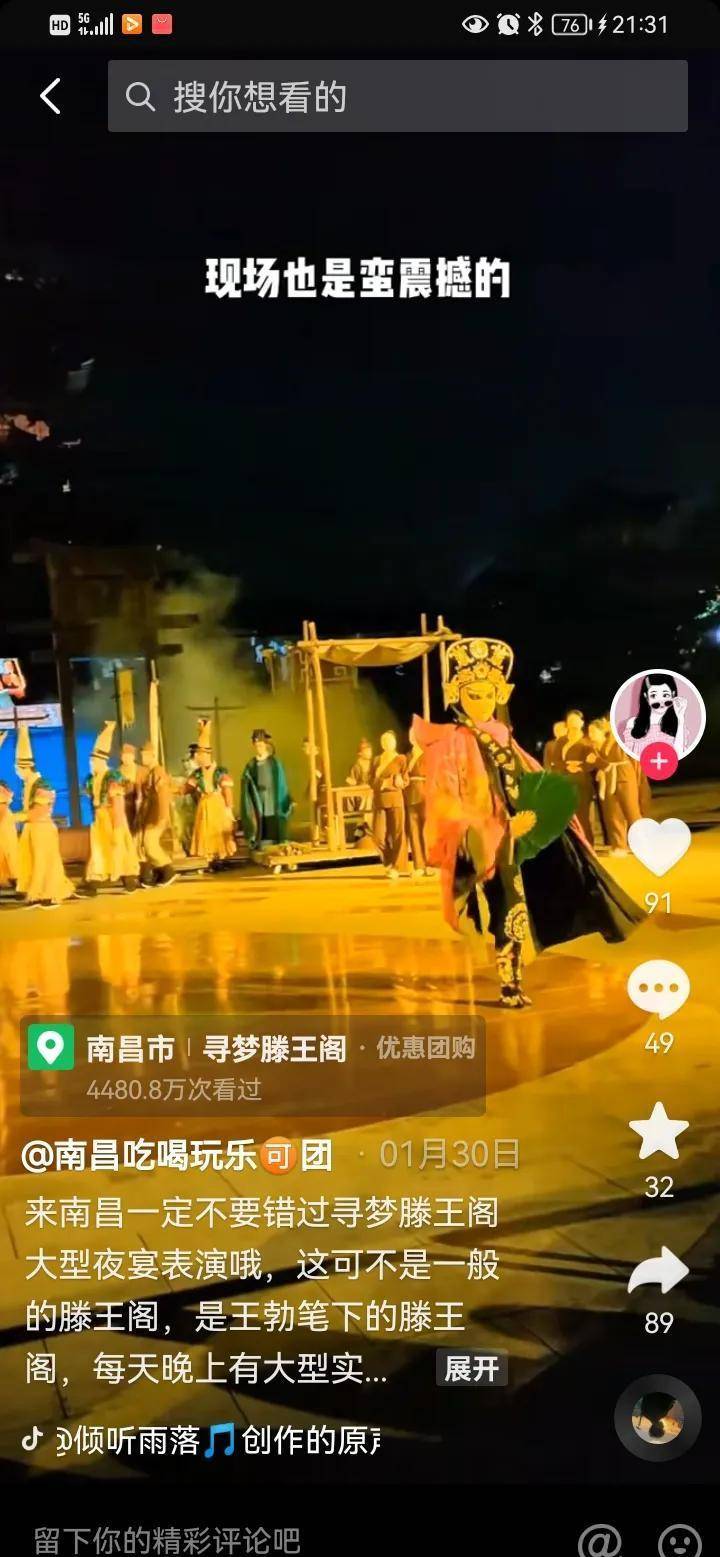 滕王阁每天晚上有大型夜宴表演,仿佛穿越到了王勃笔下的大唐盛世,这场大型实景演出由140名专职演员和100名专业工作人员组成,时长90分钟,使游客通过边游园,边体会,边欣赏的形式穿越时空,领略盛唐气势,观摩滕王雅宴。