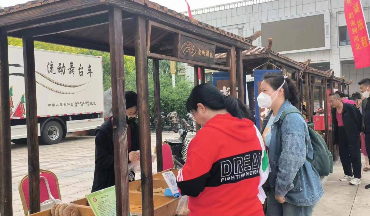 在文化艺术中心现场的两侧,以“美好中国,幸福旅程——这么近、那么美,周末到河北”为主题的道旗迎风飘扬,舞台周边设置了非遗展示和文创展示及宣传展台,电子屏幕上滚动播放着沧州旅游宣传片,吸引了五六百名观众的眼球,营造了良好的旅游氛围。活动现场还有沧州特色文艺表演,表演内容为非遗展演、武术、杂技、京剧、河北梆子、歌舞等,使人们更深入地了解家乡文化和旅游特色。