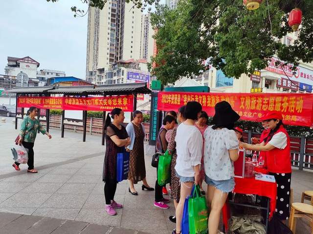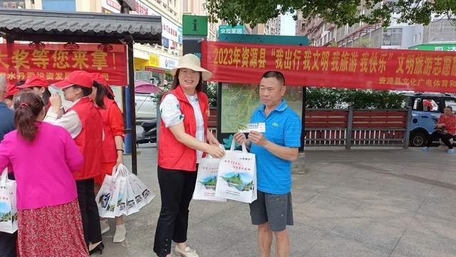 活动同时,资源县文广体旅局还将文明出行、文明旅游作为重点宣传内容之一,组织志愿者向群众免费发放小礼物、旅游宣传手提袋、旅游手册和文明旅游宣传单等,向群众介绍资源县内丰富的旅游资源,普及文明旅游知识,提醒群众爱护生态环境,爱惜公共设施,保护文物古迹,不乱扔垃圾,不乱刻乱画等,引导群众文明旅游、安全出游。
