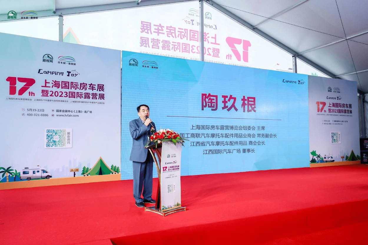 19日上午,展会开幕式准时在展会主舞台处召开,上海国际房车露营博览会组委会主席、全国工商联汽车摩托车配件用品业商会常务副会长、江西省汽车摩托车配件用品商会会长、江西国际汽车广场董事长-陶玖根,上海市嘉定区文化和旅游局副局长-金芬 以及众多特邀嘉宾依次为本次展会进行了精彩的开幕致辞,并对展会的成功召开表示祝贺。