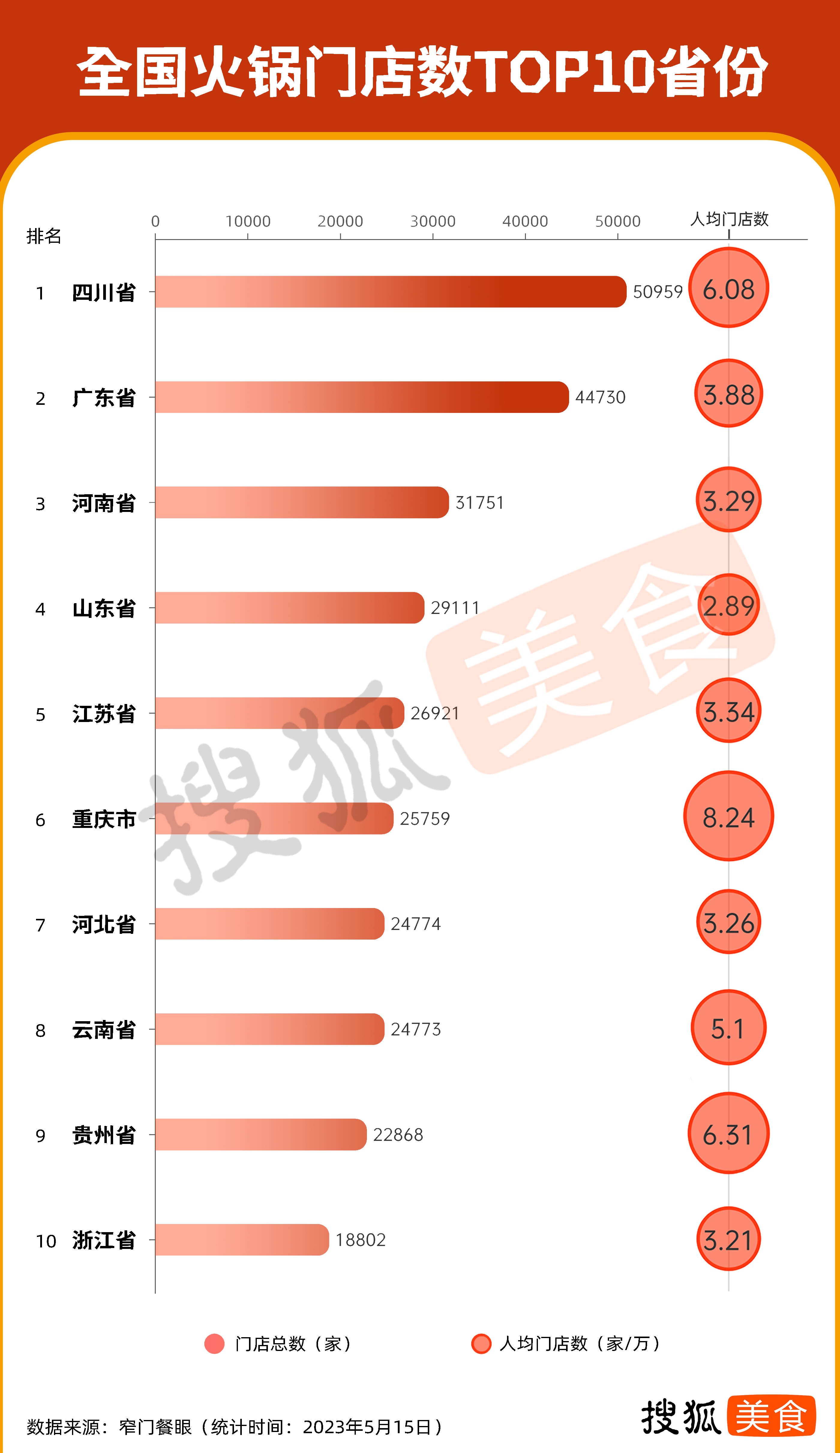 搜狐美食对全国各省的火锅门店数进行排名后发现,四川、广东、河南排名前三,火锅门店数量均已超过3万家,排名第一四川省拥有火锅门店5万余家,是妥妥的“火锅大省”。前十名中,重庆是唯一入围的直辖市,总门店数排在第六位。
