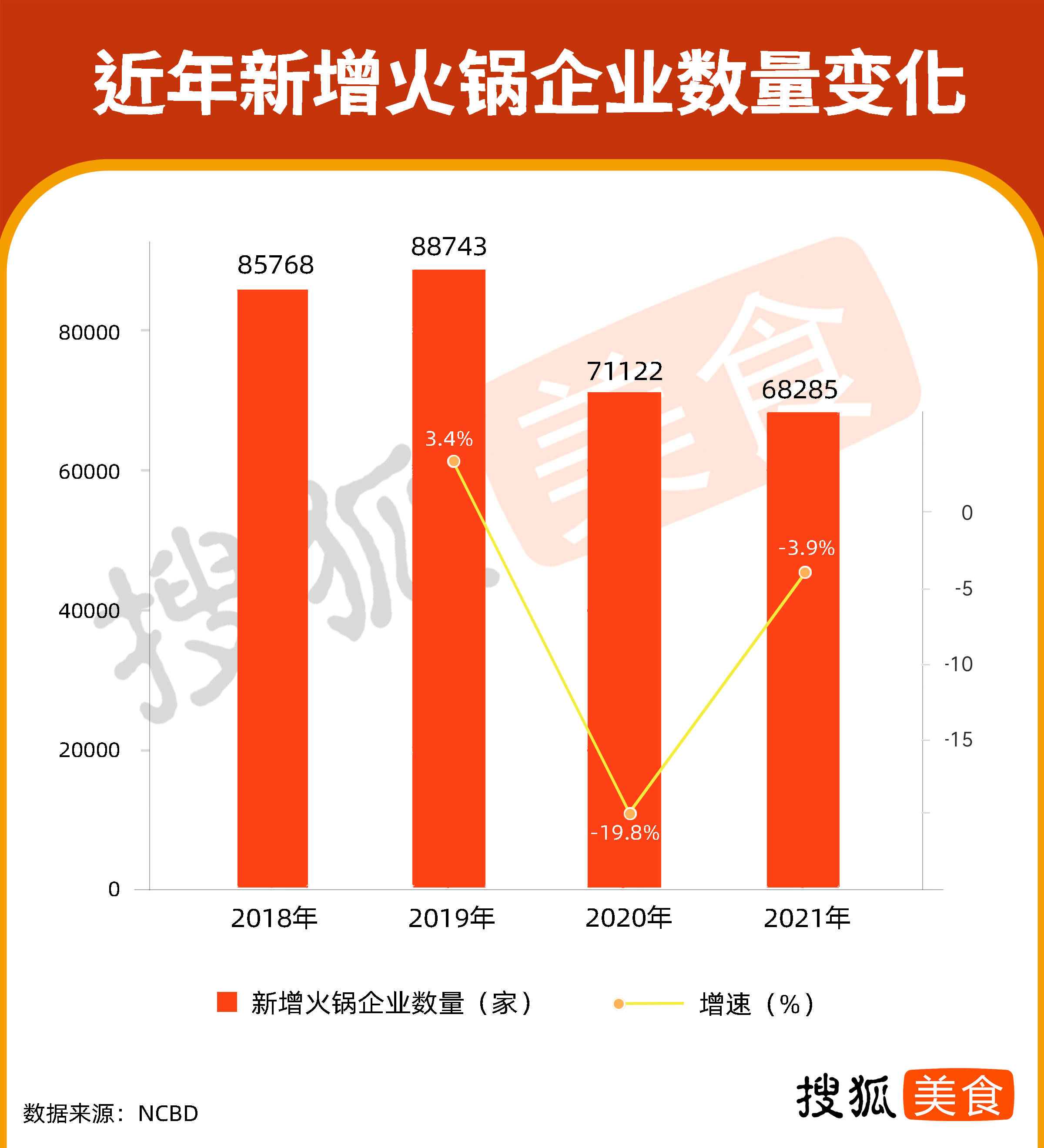 搜狐美食统计了2018-2021年火锅企业新增情况。近年来,火锅企业仍保持逐年大规模增长。2019年,新成立的火锅企业近9万家。2020年受新冠疫情影响,增速大幅下降,但2021年增速有较大回弹。火锅仍旧是被看好的赛道。