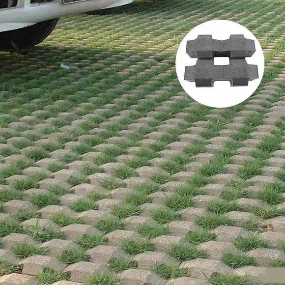 直接种植草地已经逐渐被淘汰,停车场地是要承受一定的重量的,每天车辆来回停放,会使得地面凹陷,下雨天还会积水,土地淤泥,有可能会导致车子陷进去开不出来。绿地采用井字型植草砖铺设,井字型植草砖空心砌块设计,渗水性好,中空位置可以让草本植物生长(又称为嵌草砖),即便过车也不会压坏。