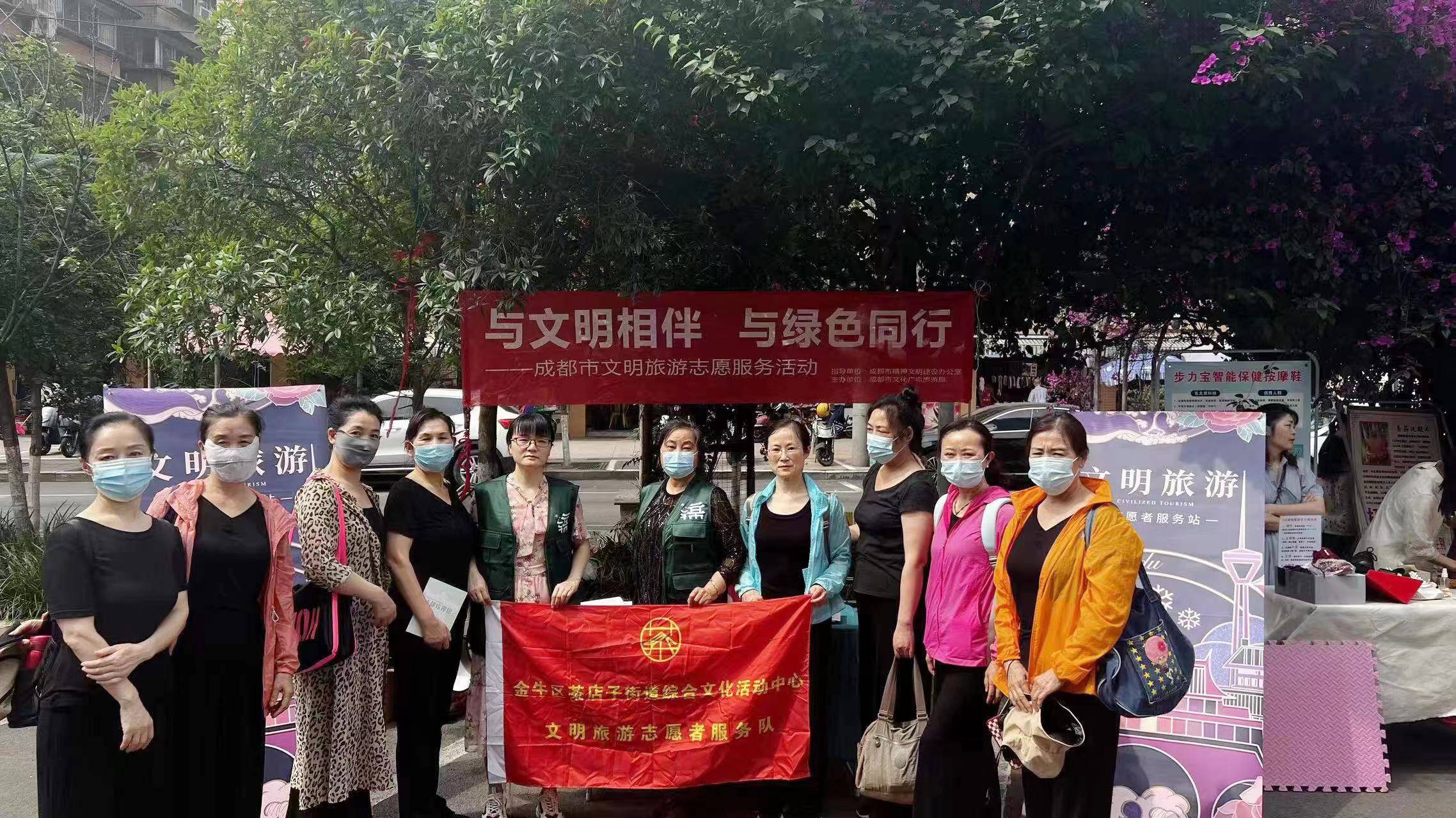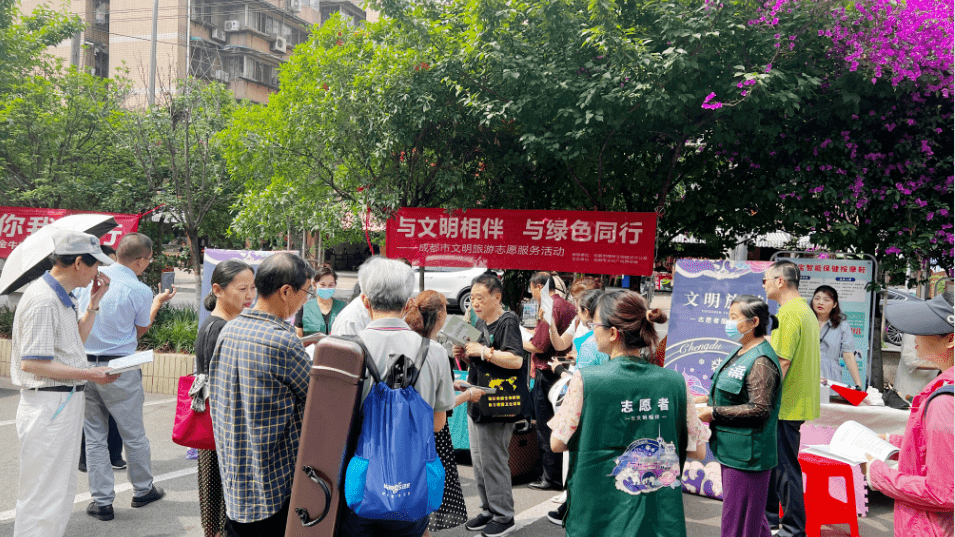 成都旅游学会文明旅游志愿者服务队、成都市乡村旅游产业商会文明旅游志愿者服务队、成都市金牛区茶店子街道综合文化活动中心文明旅游志愿者服务队走进十多个社区广场设立了宣传展台,向广大居民发放近千份文明旅游宣传资料,500余份文明知识问答卷,并开展健康、文明就餐等指导,金牛区文体局、茶店子街道办组织文艺表演队围绕防止网络诈骗、文明出行、文明健康用餐等内容编演了丰富多彩的文艺节目,受到社区群众的热烈欢迎。